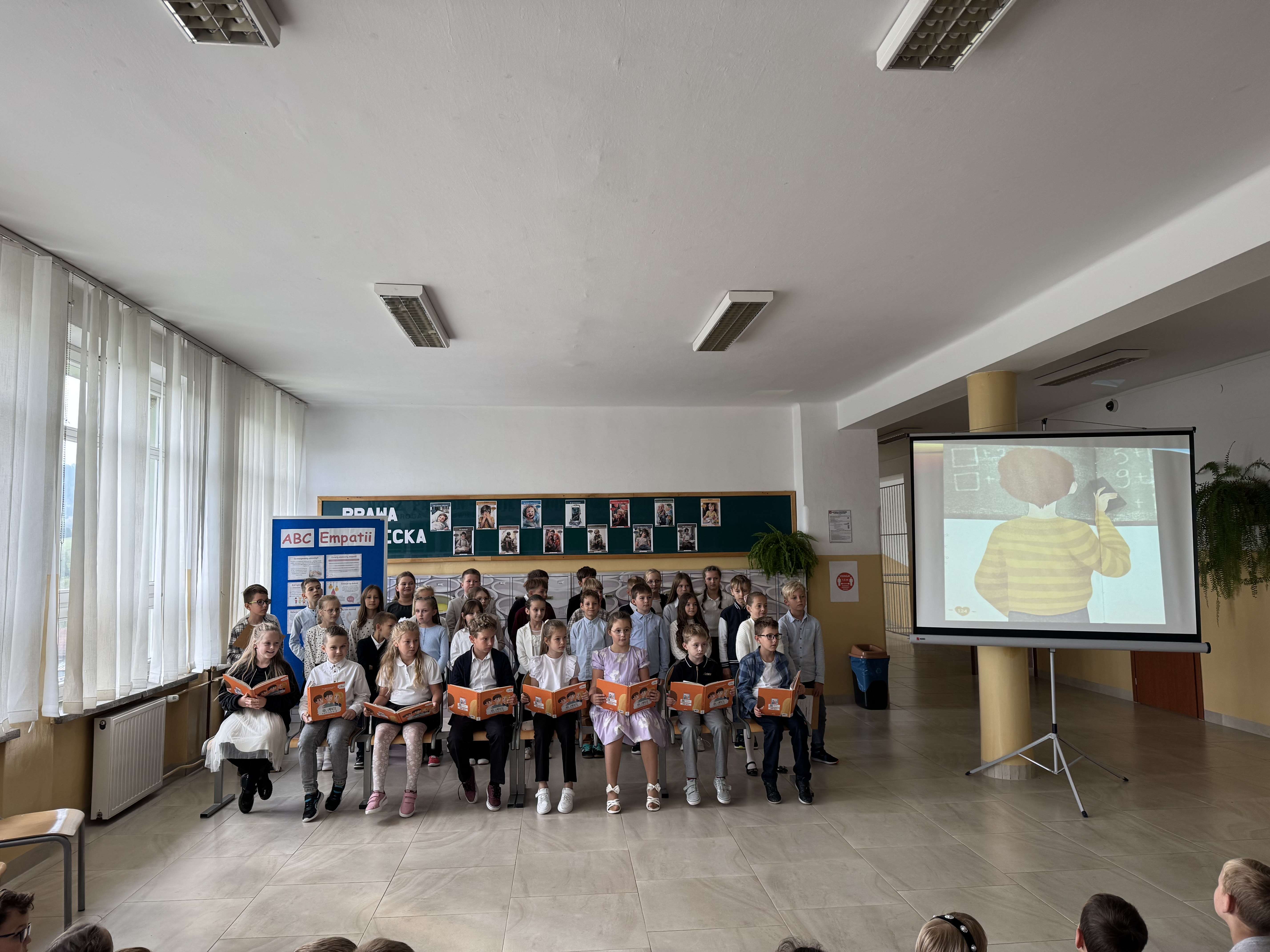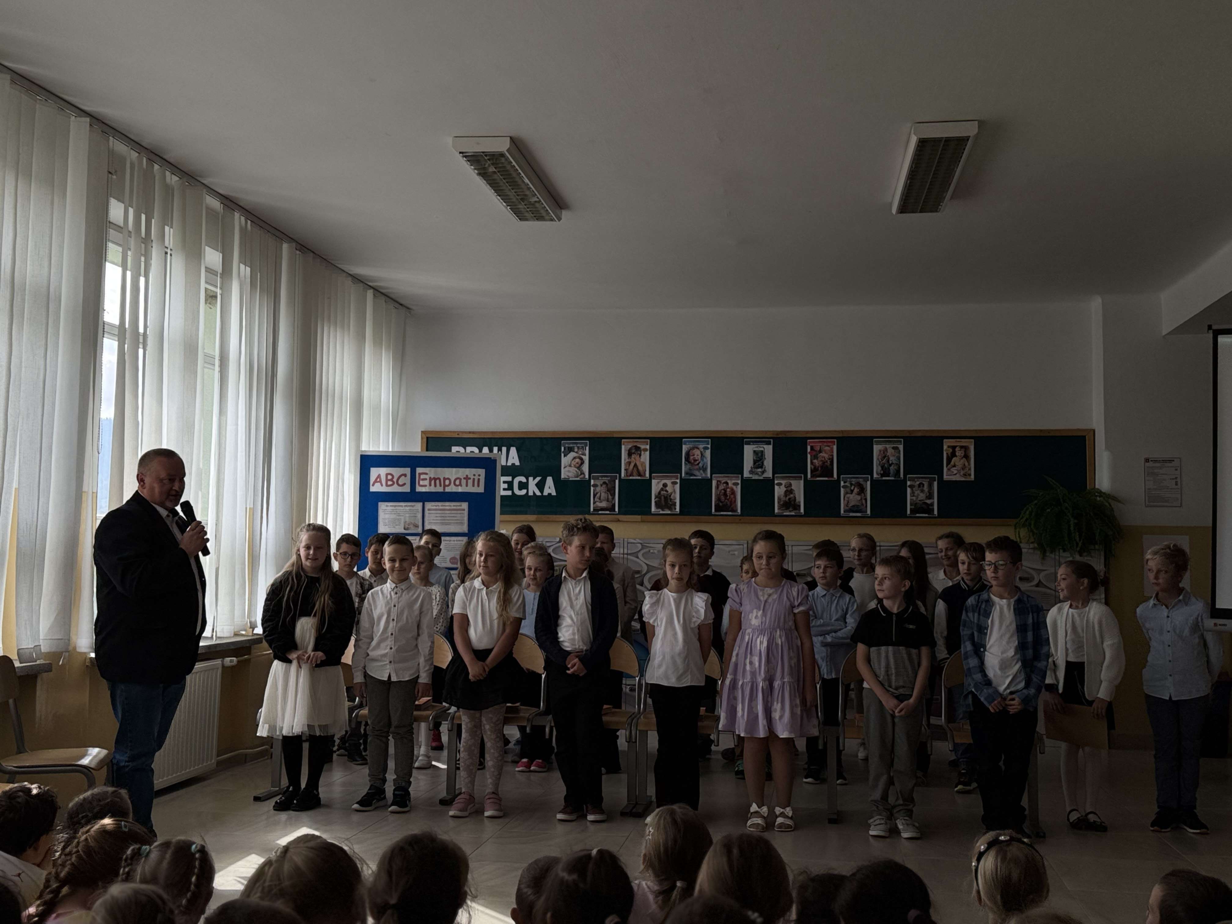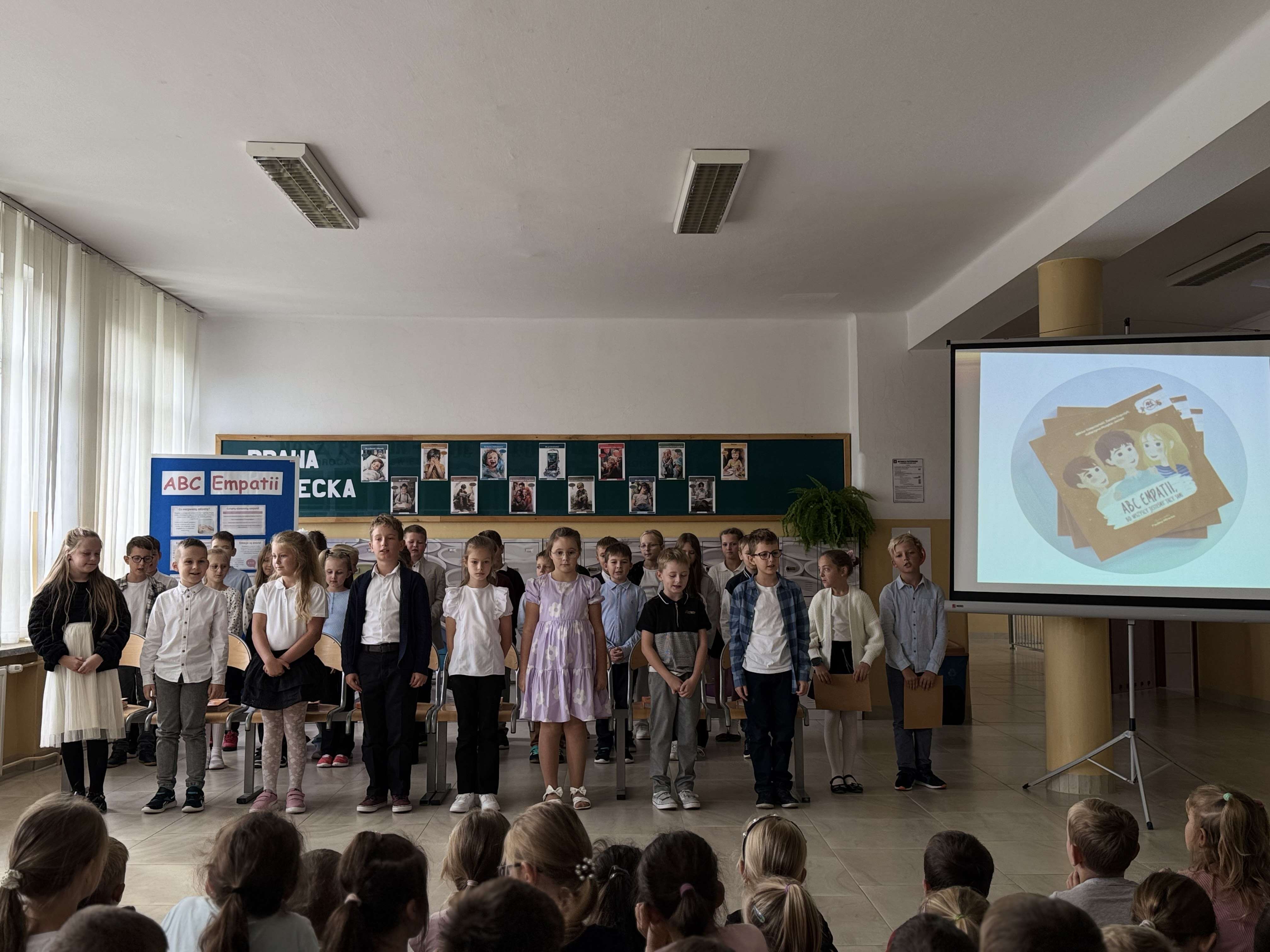 - W klasach edukacji wczesnoszkolnej zorganizowano „Dzień Empatii”, którego głównym celem było kształtowanie u uczniów zdolności dostrzegania oraz zrozumienia emocji i potrzeb innych ludzi, szczególnie kolegów i koleżanek. Uczniowie klas trzecich przedstawili prelekcję, w której w prosty, jednocześnie delikatny i merytoryczny sposób pokazali jakie trudności muszą pokonywać każdego dnia osoby z trisomią 21, a także w jaki sposób należy zachowywać się w stosunku do nich, aby one mogły czuć się bezpiecznie i komfortowo w naszej obecności. Było to kolejne spotkanie realizowane w ramach projektu „ABC Empatii – bo wszyscy jesteśmy tacy sami”.