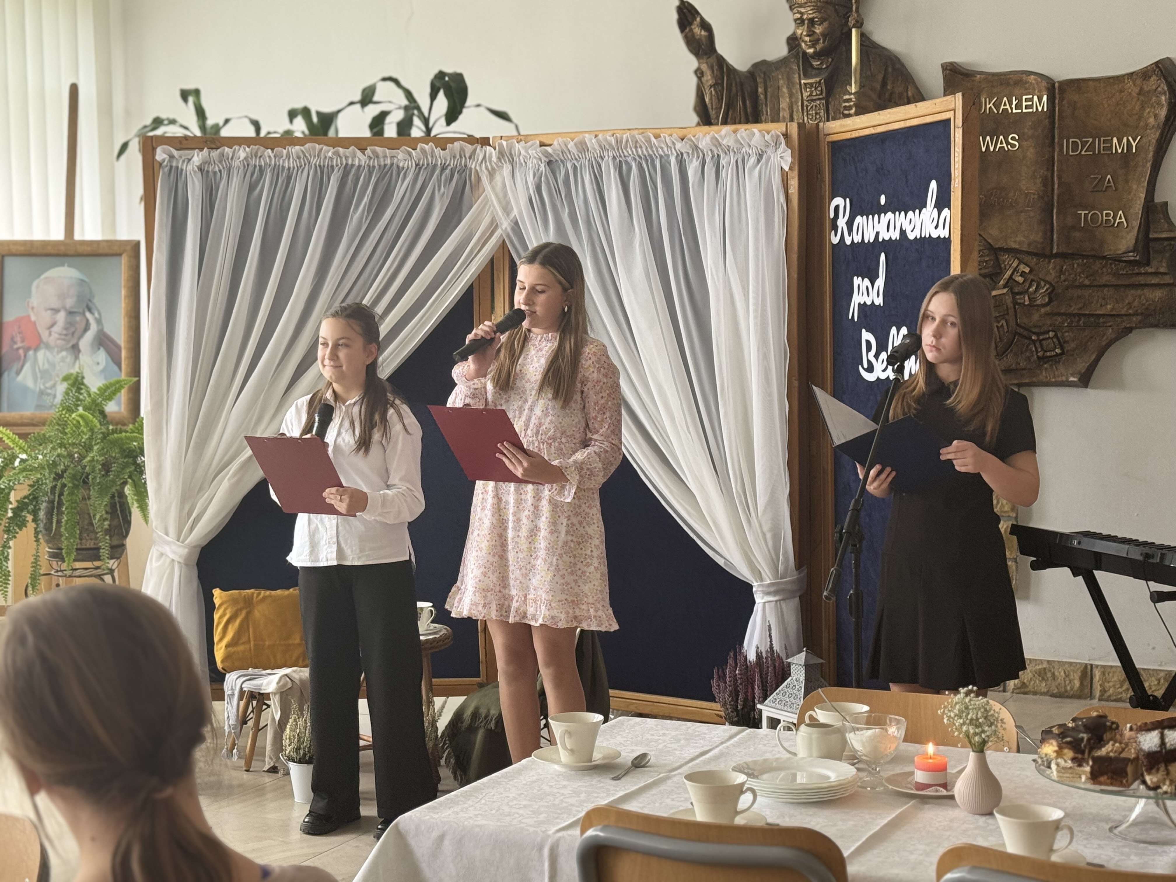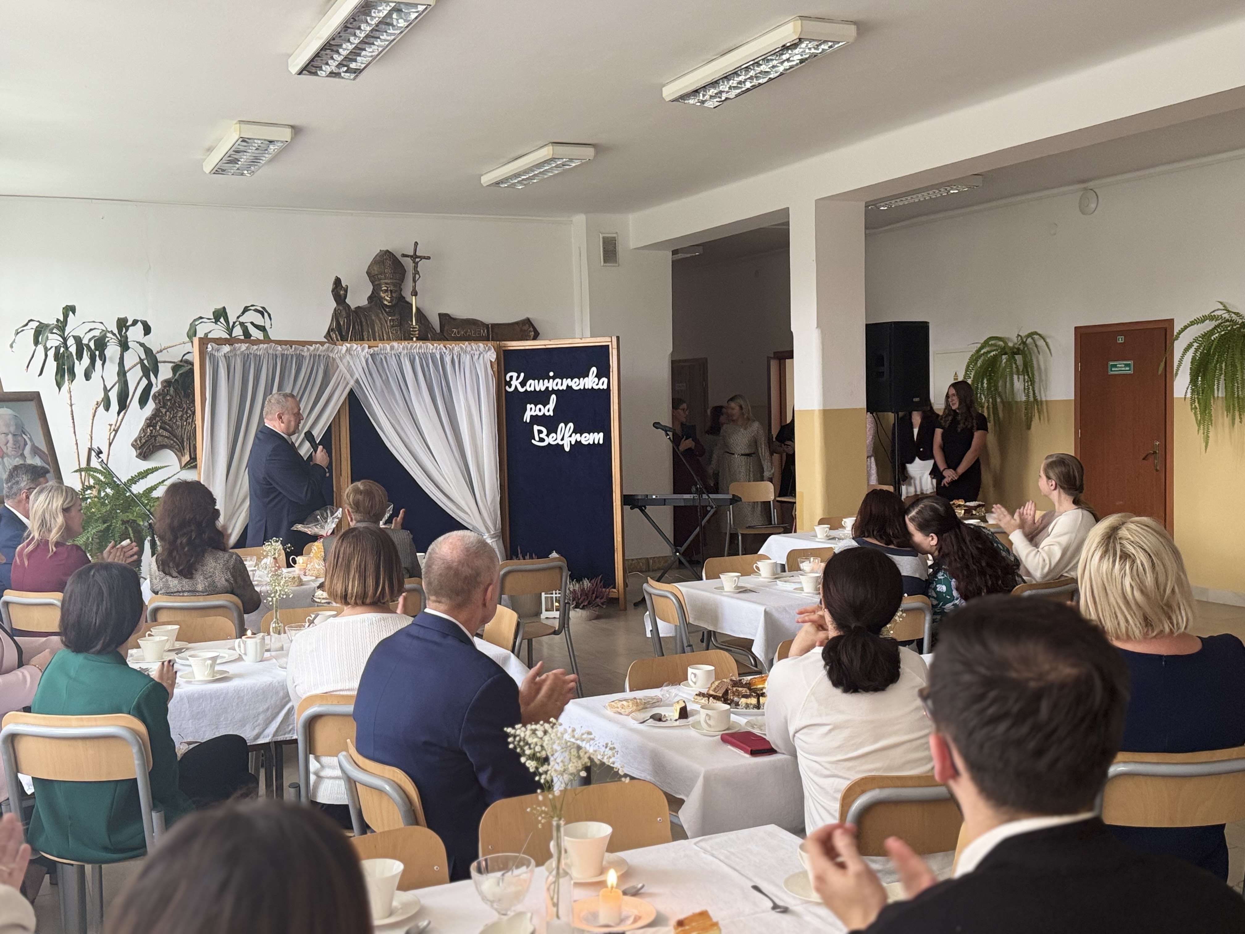 Kadrę pedagogiczną, pracowników szkoły i gości w osobach przedstawicieli rodziców powitały dwie urocze prezenterki, zachęcając do zrelaksowania się oraz korzystania z poczęstunku w postaci domowych wypieków. Pyszne ciasta były upominkiem od rodziców dla nauczycieli z okazji ich święta. „Kawiarenka pod Belfrem” gościła tego dnia artystów – amatorów. Na repertuar złożyły się piosenki, które przez lata królowały na polskich estradach. Koncert rozpoczął się oczywiście od utworu „Kawiarenki”, a po nim w krainę łagodności przenosiły nas takie szlagiery jak: „ Nic dwa razy”, „Wsiąść do pociągu byle jakiego”, „Tanie dranie”, „Jeszcze w zielone gramy” czy „Radość o poranku”. Każdy z przebojów był opatrzony krótkim komentarzem będącym swoistą dedykacją i ukłonem w stronę pedagogów oraz pracowników szkoły. Całości dopełniły utwory poetyckie o nostalgicznej i zabawnej wymowie. W finałowej części koncertu wypowiedziane zostały życzenia pod adresem nauczycieli zarówno ze strony uczniów, jak i zaproszonych gości, a występujący artyści wręczyli wszystkim drobne upominki.