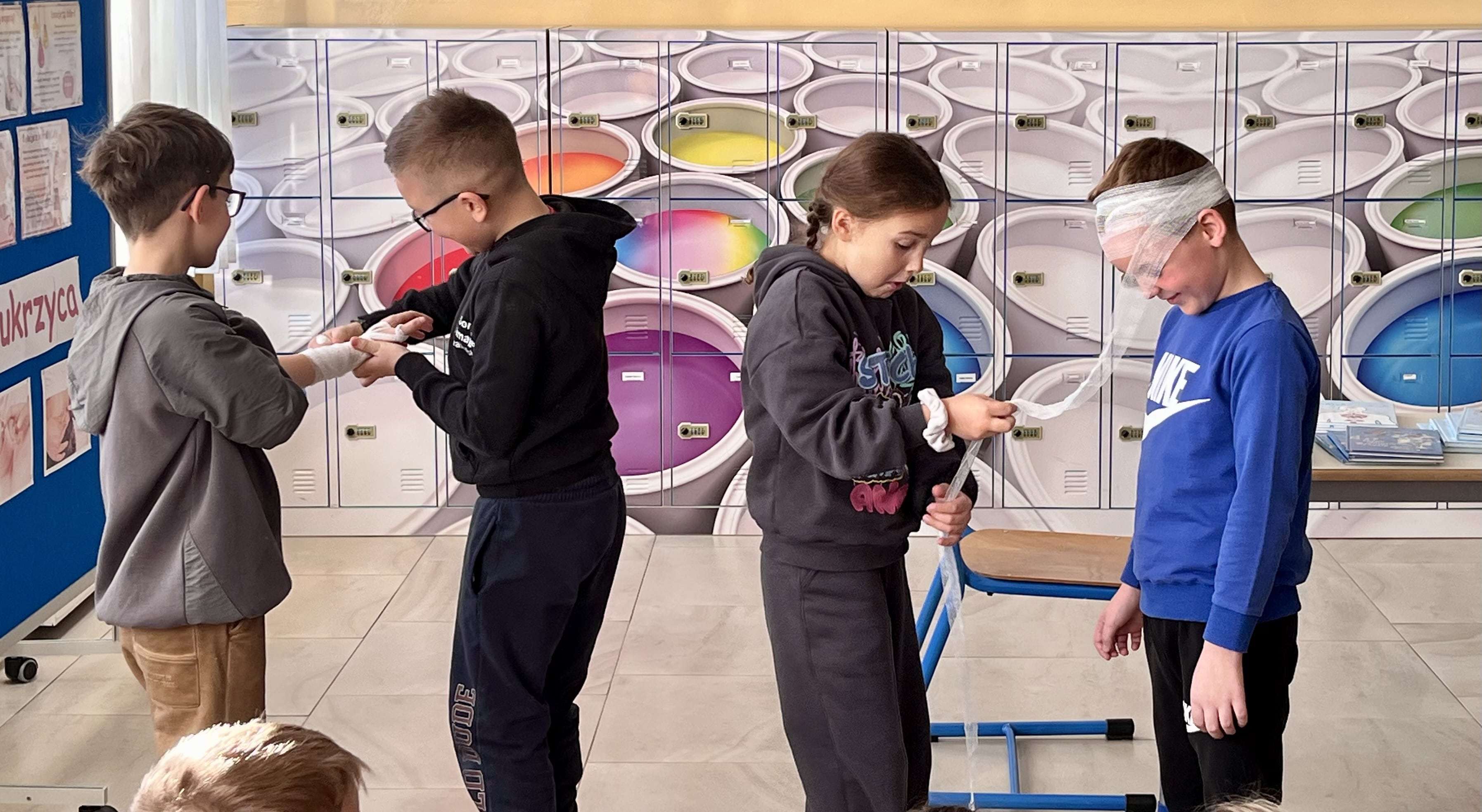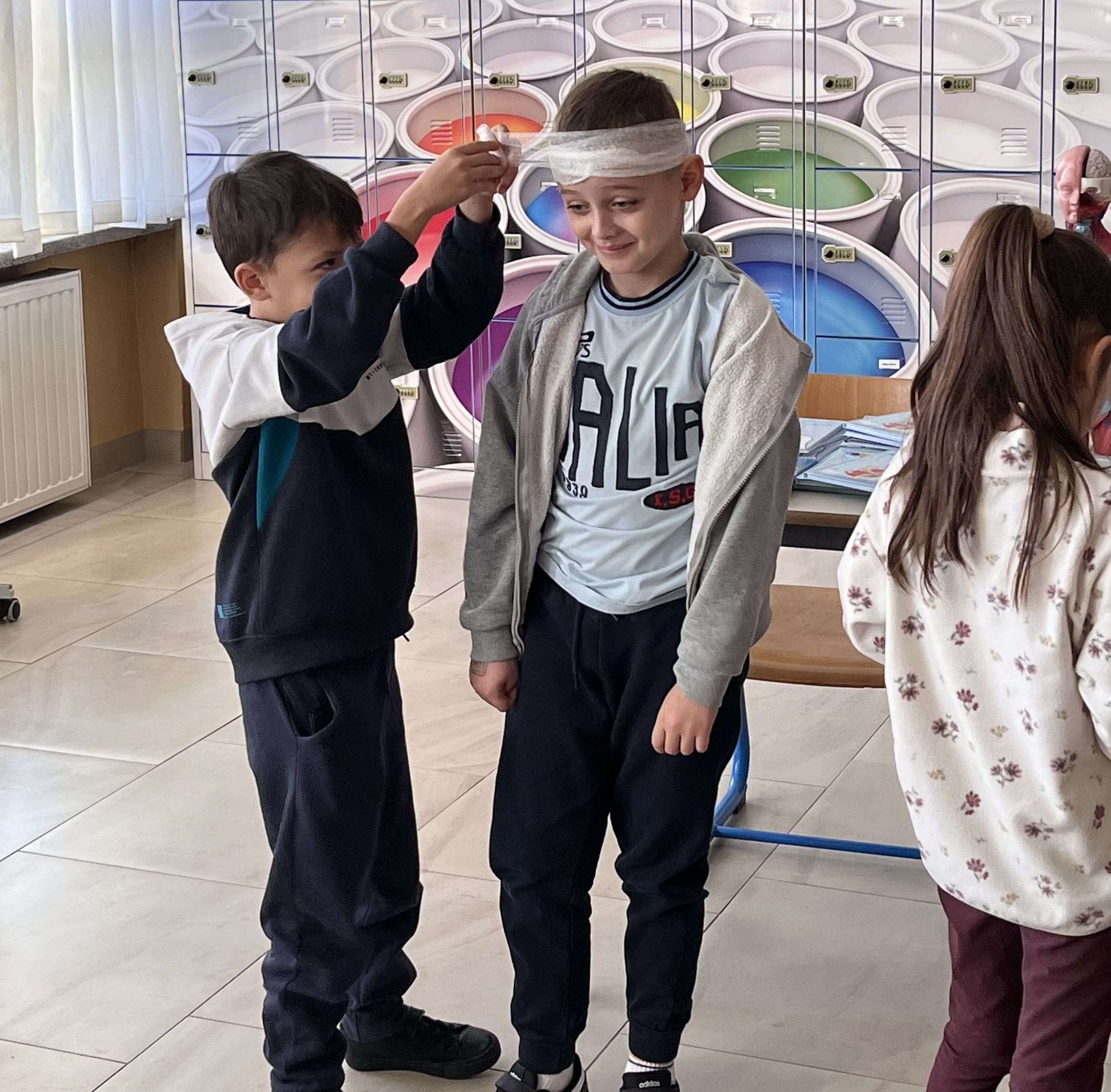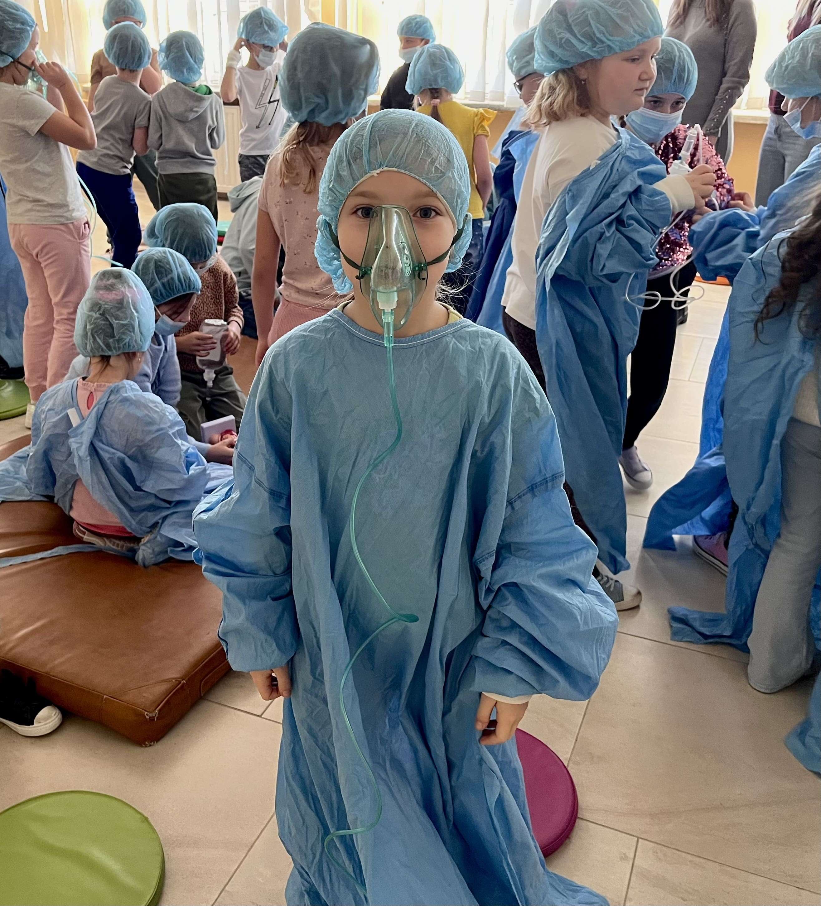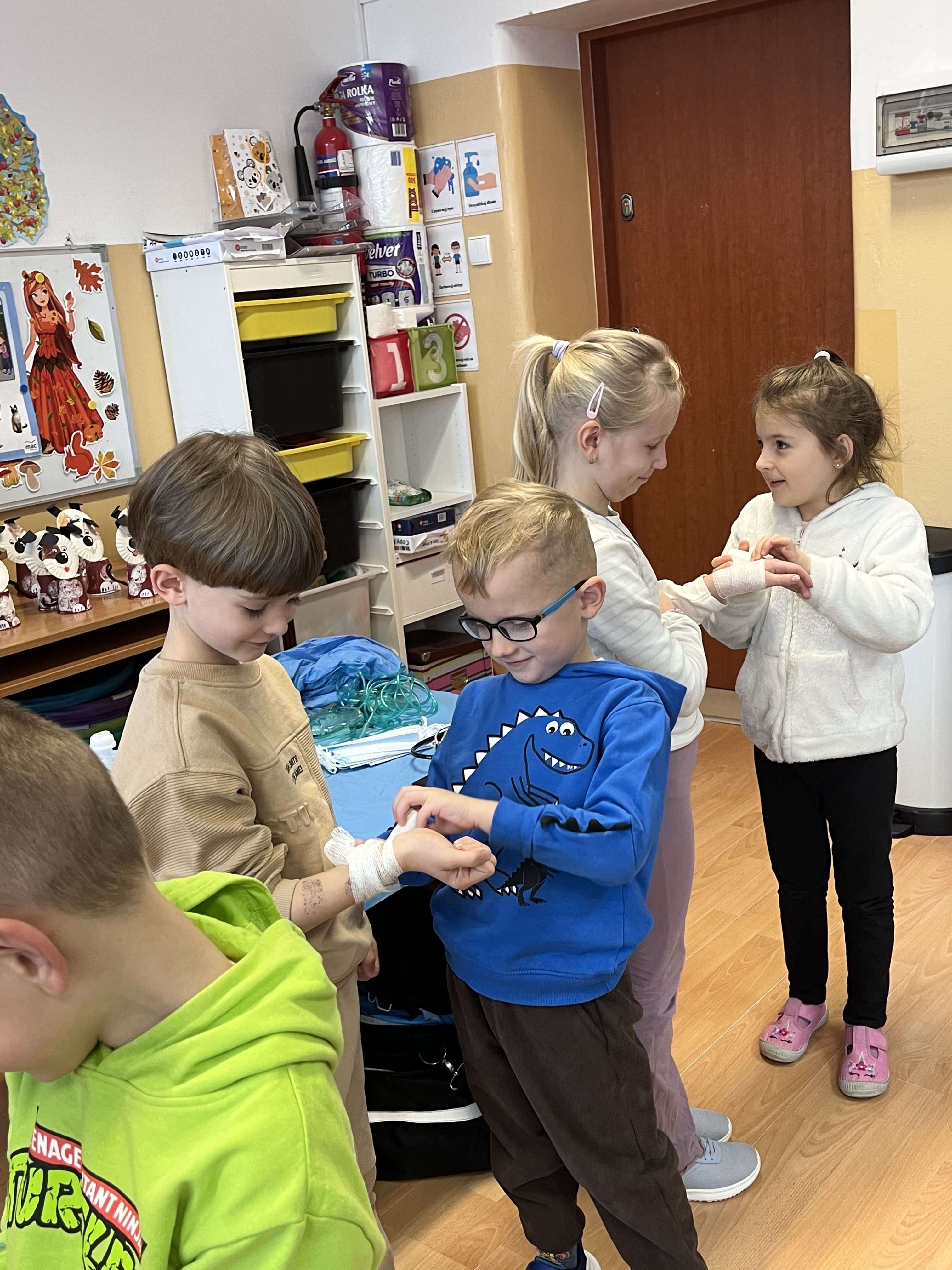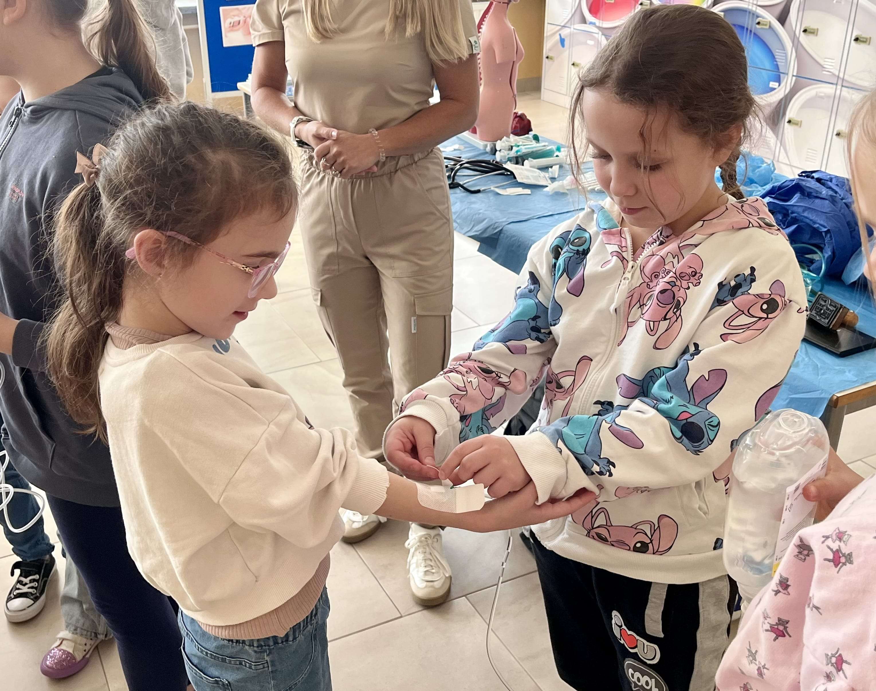 W drugiej części zajęć przyszła pora na prawdziwe warsztaty medyczne. Dzieci uczyły się bandażowania, mogły założyć wenflon, podłączały kroplówkę, a także poznawały, jak wykonuje się zastrzyki. Z ogromnym zaangażowaniem wcielały się w role małych lekarzy i pielęgniarek, zakładając fartuchy, czepki, rękawice oraz maseczki. Nie zabrakło uśmiechu, ekscytacji i dobrej zabawy – sala na chwilę zamieniła się w przyjazny, pełen ciepła „szpital”.