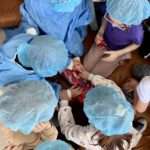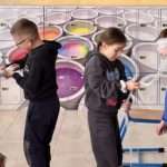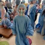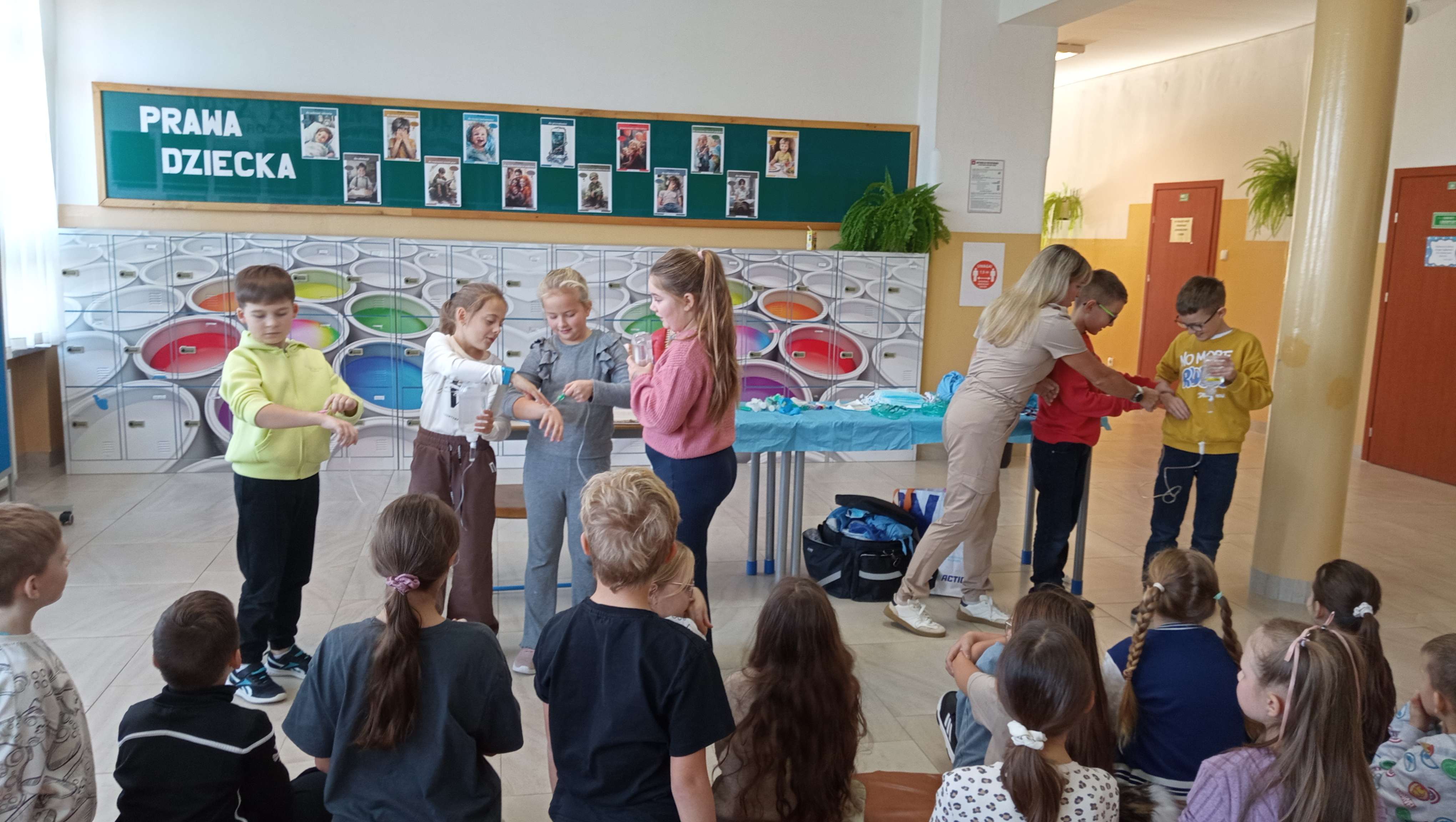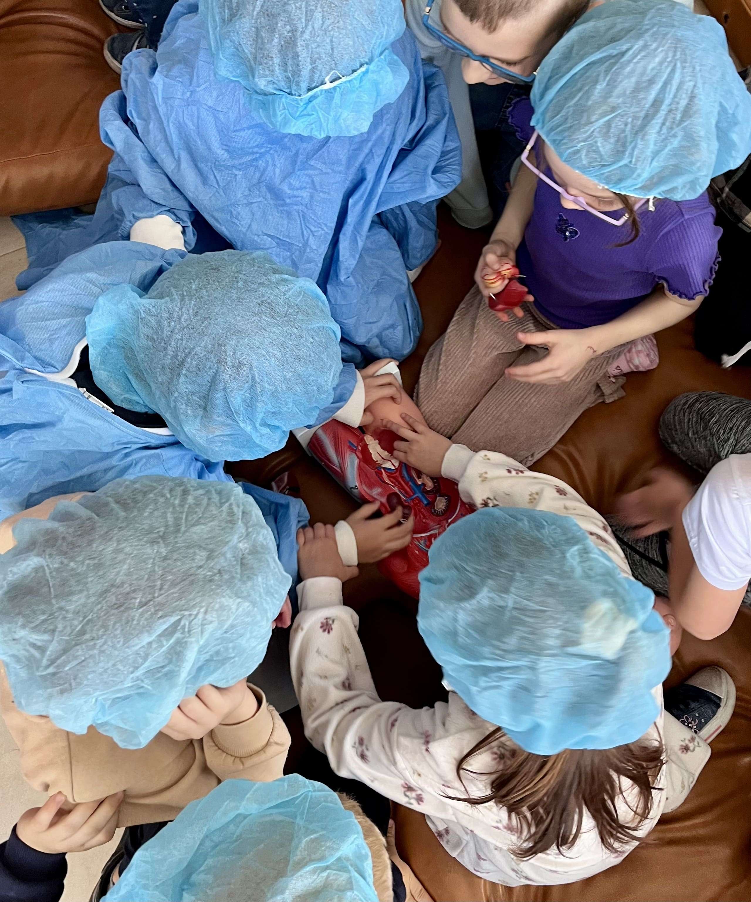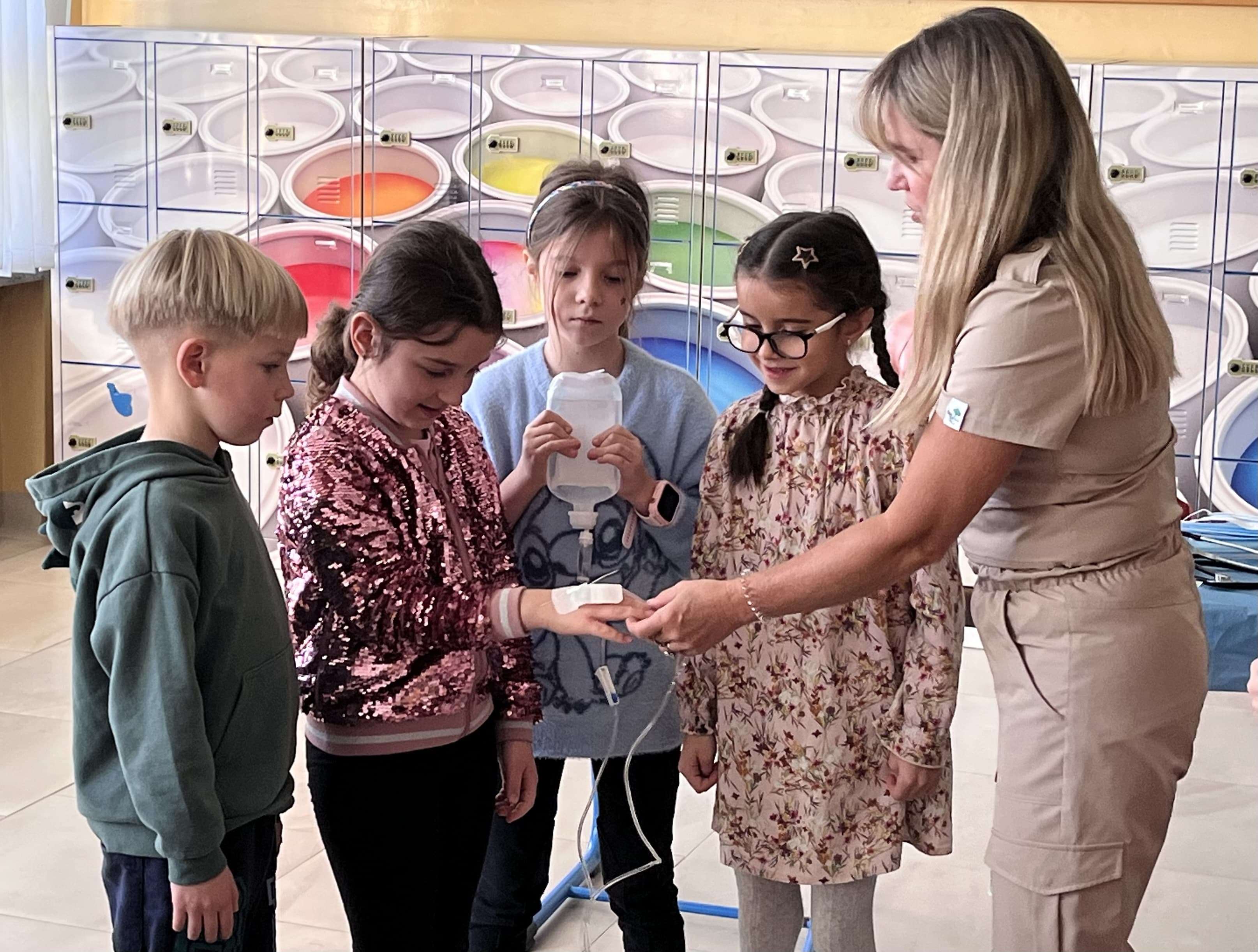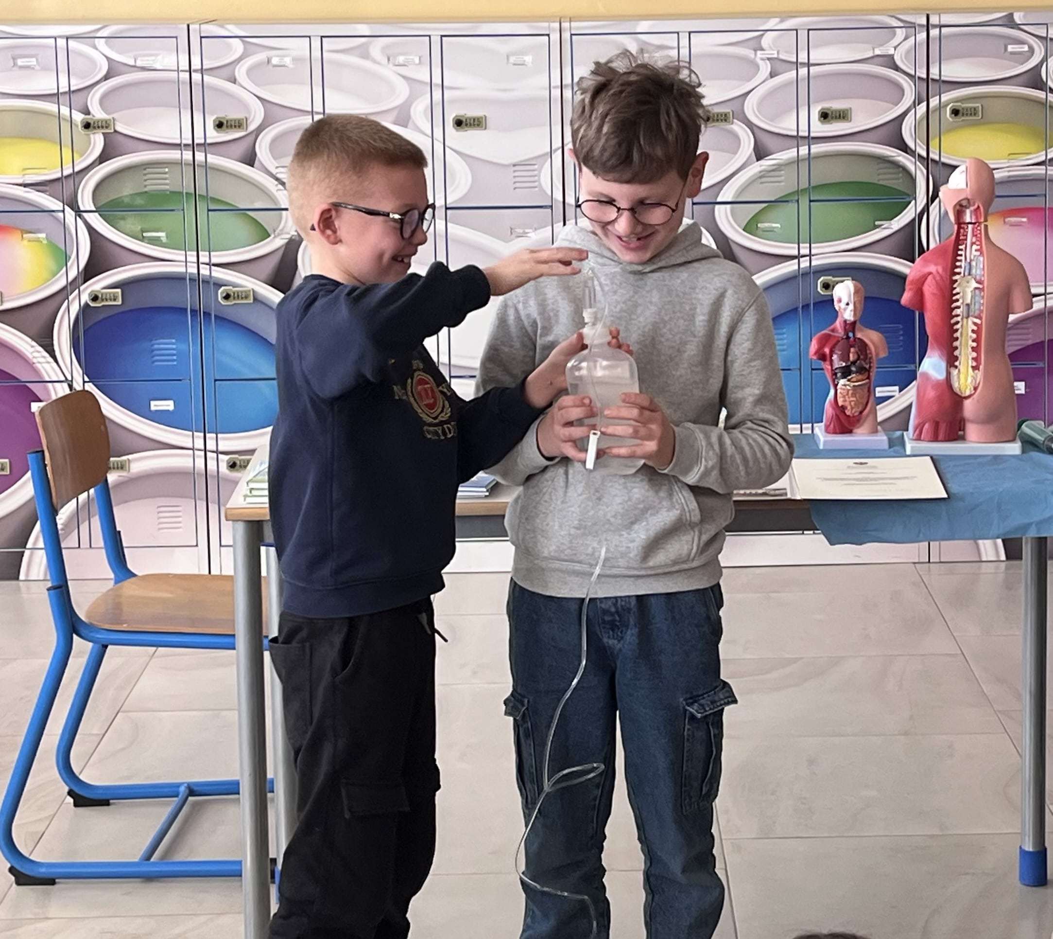 W drugiej części zajęć przyszła pora na prawdziwe warsztaty medyczne. Dzieci uczyły się bandażowania, mogły założyć wenflon, podłączały kroplówkę, a także poznawały, jak wykonuje się zastrzyki. Z ogromnym zaangażowaniem wcielały się w role małych lekarzy i pielęgniarek, zakładając fartuchy, czepki, rękawice oraz maseczki. Nie zabrakło uśmiechu, ekscytacji i dobrej zabawy – sala na chwilę zamieniła się w przyjazny, pełen ciepła „szpital”.