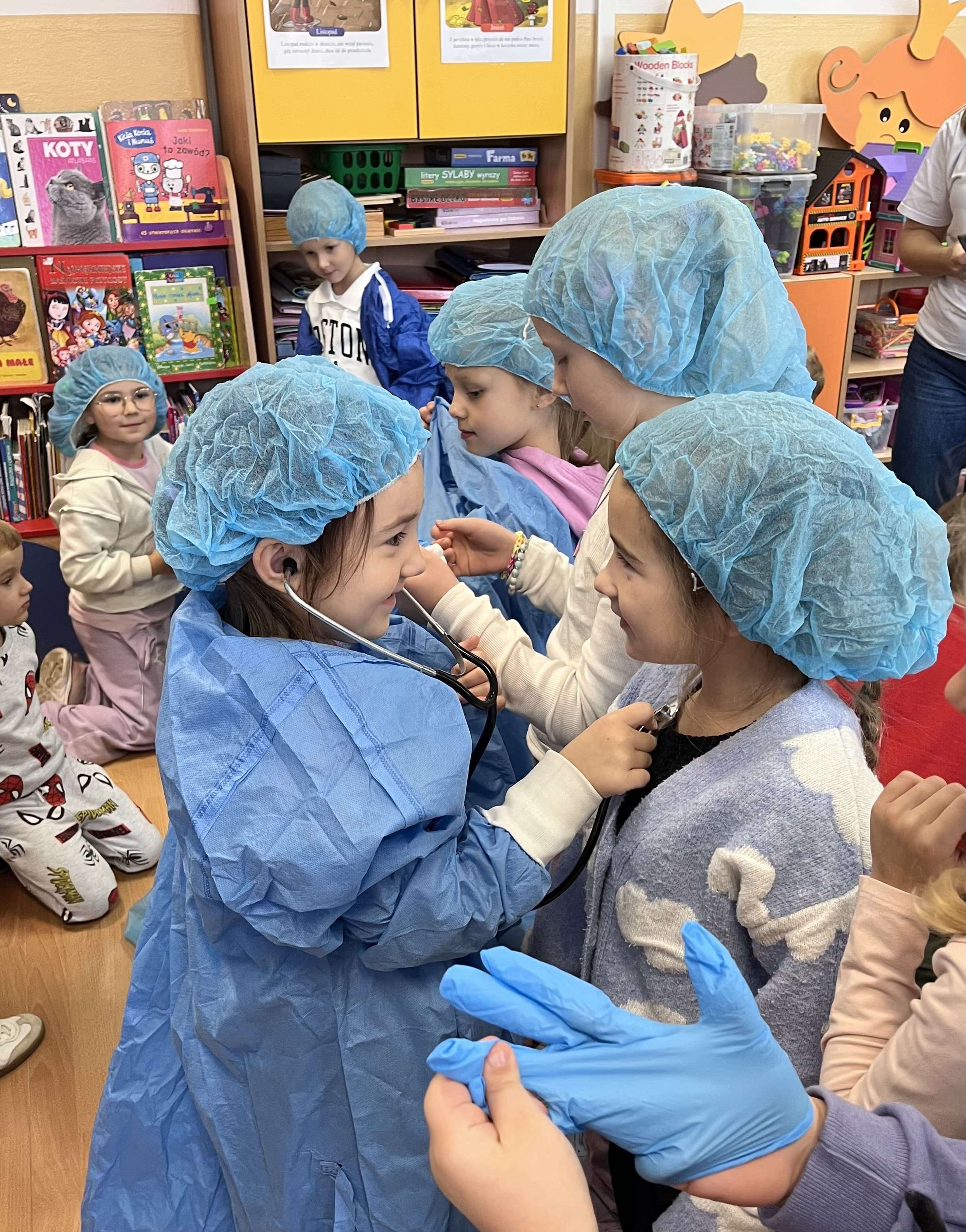 Takie spotkania to nie tylko ciekawa przygoda, lecz także ważna lekcja. Dzięki bezpośredniemu kontaktowi z narzędziami i wiedzą medyczną, a przede wszystkim dzięki życzliwości Pani Kariny, dzieci zdobyły cenne doświadczenia i oswoiły temat wizyt w gabinecie lekarskim czy pobytu w szpitalu. Wierzymy, że po tych zajęciach będą podchodzić do nich z większym spokojem, zaufaniem i odwagą — wiedząc, że za medycznymi procedurami stoją ludzie, którzy chcą im pomóc.