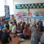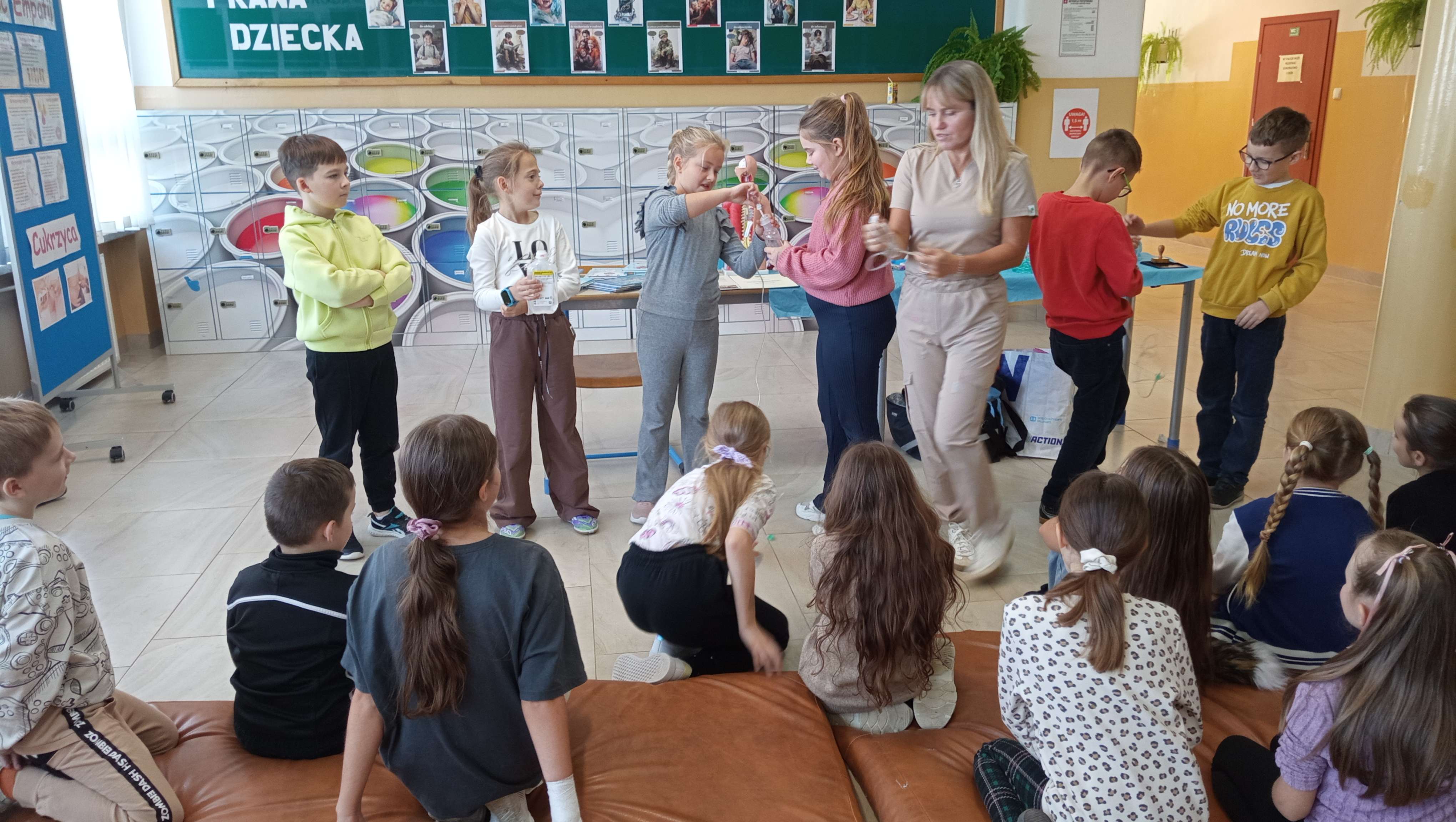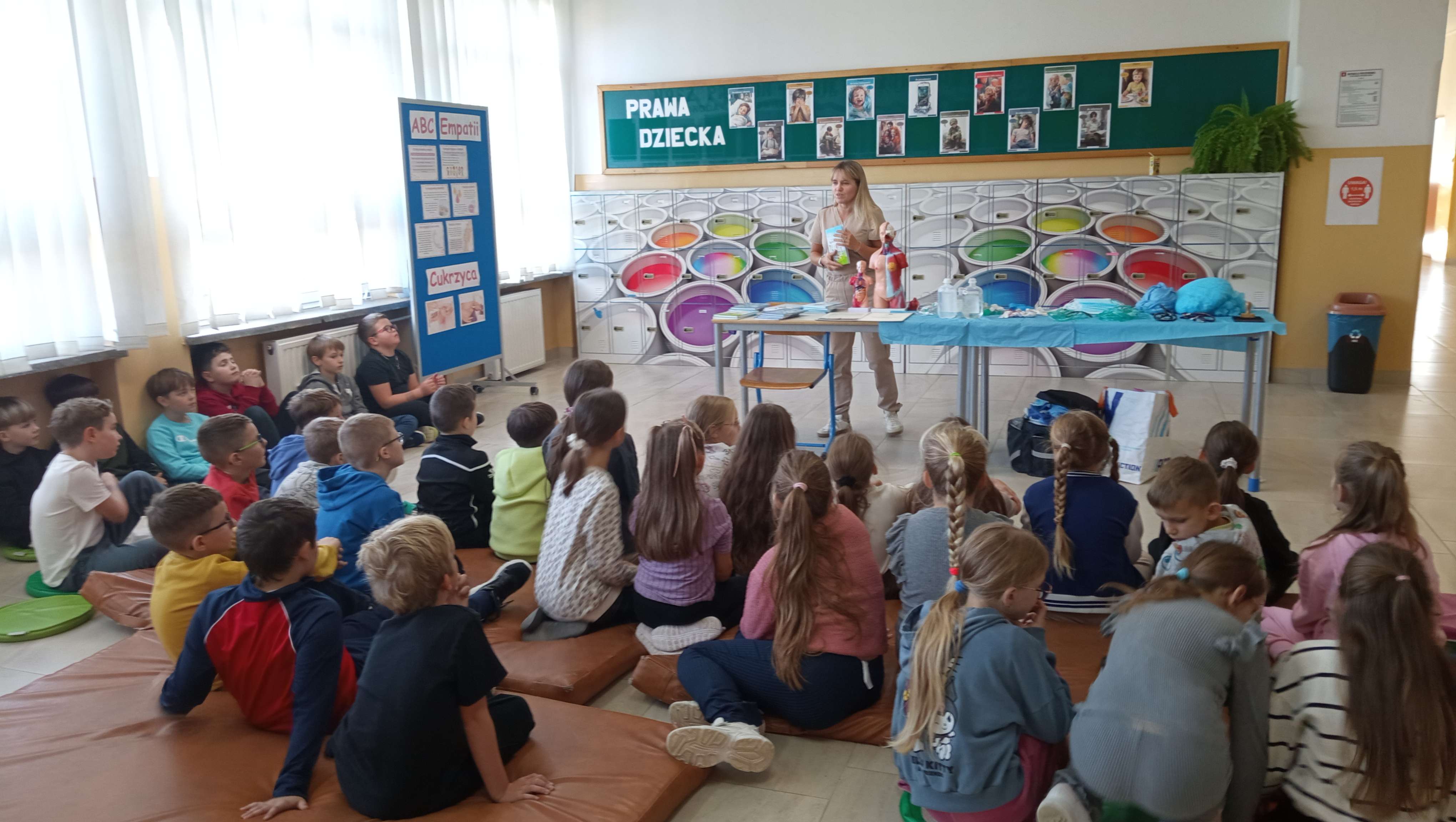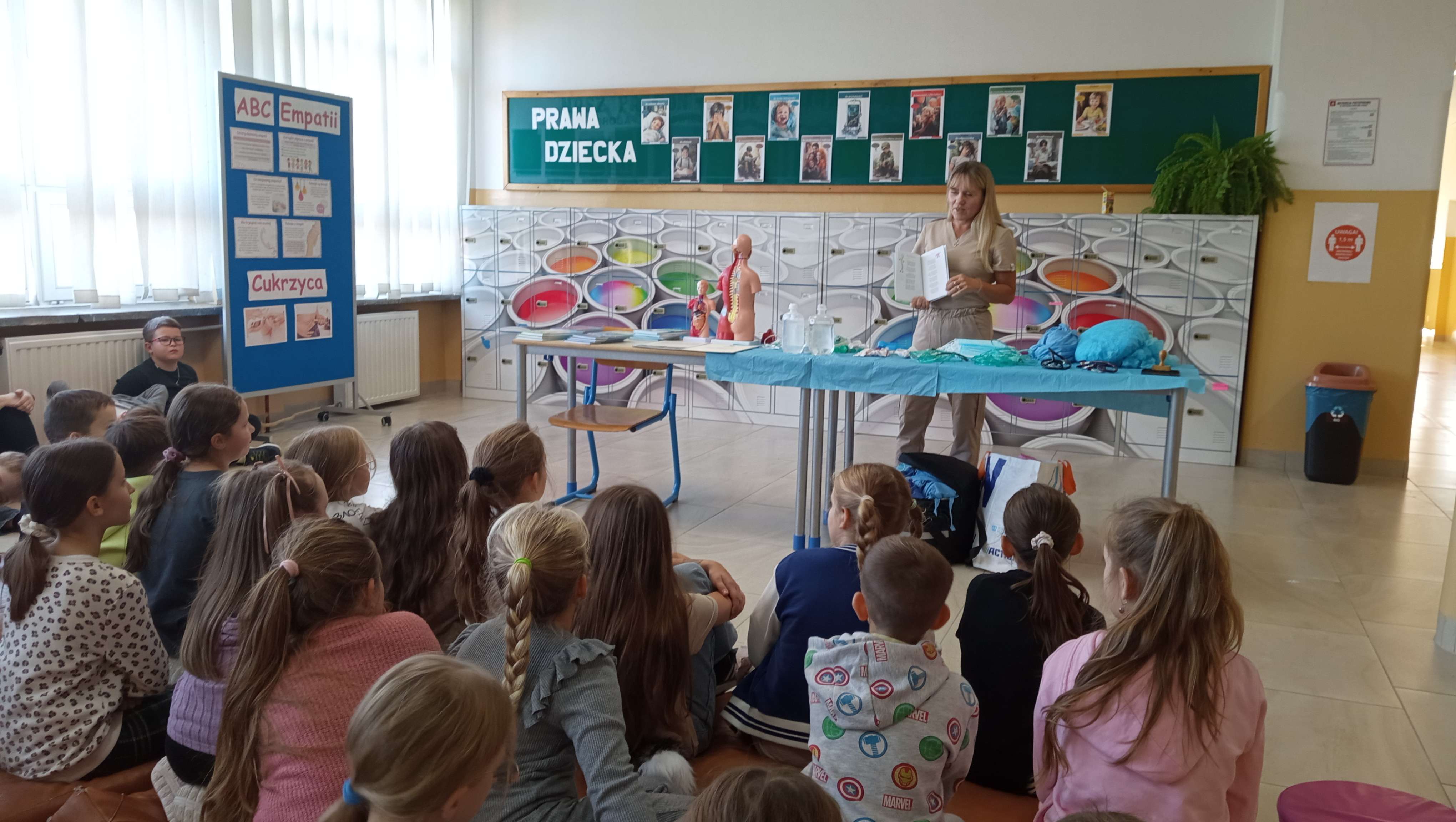 W dniu 20 listopada dzieci z oddziałów przedszkolnych 0A i 0B oraz uczniowie z klas I-III wzięli udział w wyjątkowym spotkaniu z Panią Kariną Gamoń – położną, znaną z działalności charytatywnej, autorką książek terapeutycznych dla dzieci. W trakcie spotkania Pani Karina w niezwykle ciepły i przystępny sposób opowiadała o swojej codziennej pracy na oddziale szpitalnym, przybliżając dzieciom świat medycyny z perspektywy osoby, która każdego dnia niesie pomoc innym. Przedstawiła także swoje książki terapeutyczne, m.in. „Szpitalny domek”, „Fabryka w ciele tyka” oraz „Gdzie zmysły prysły”, które pomagają najmłodszym lepiej zrozumieć, jak funkcjonuje ludzkie ciało.