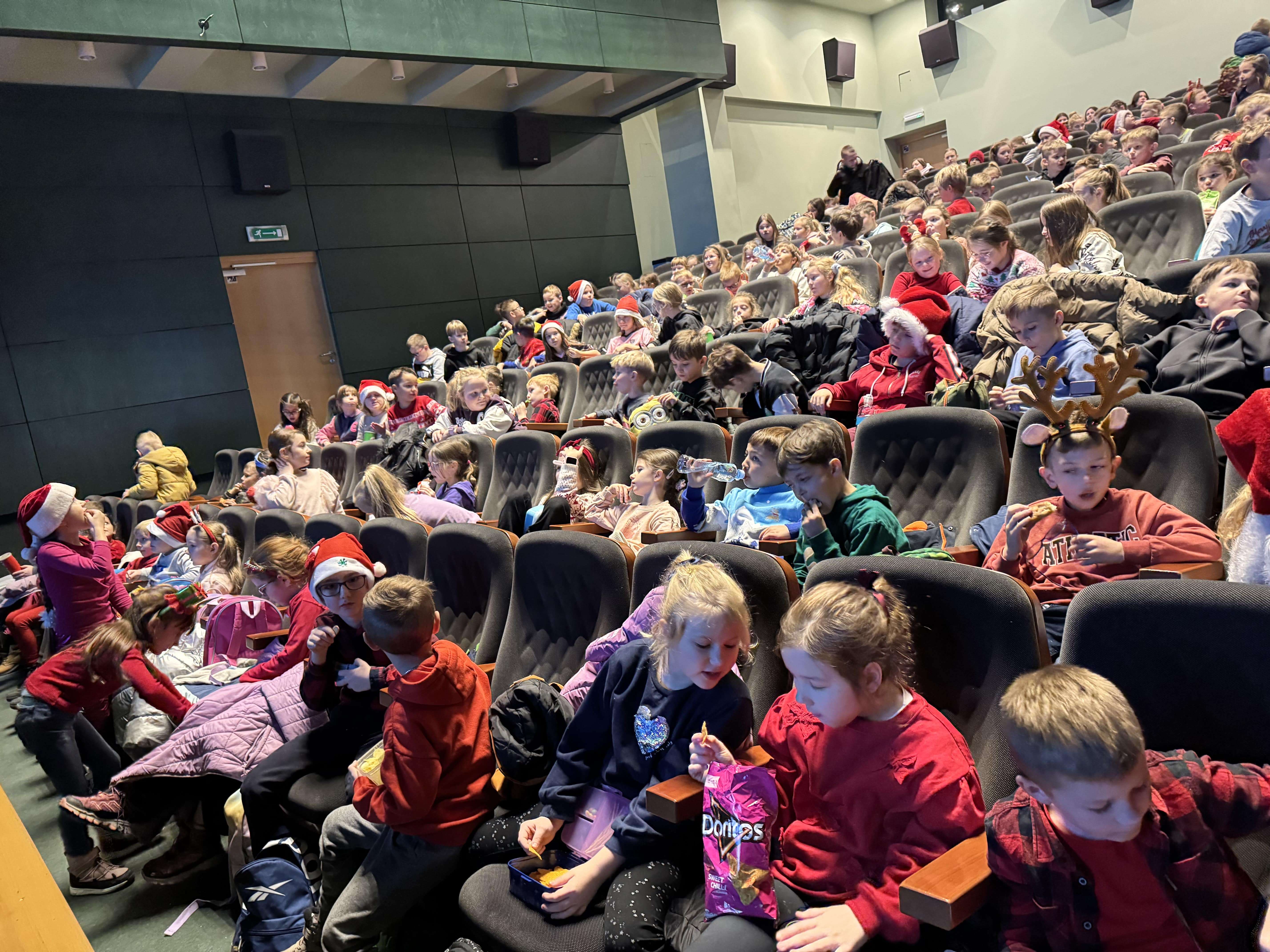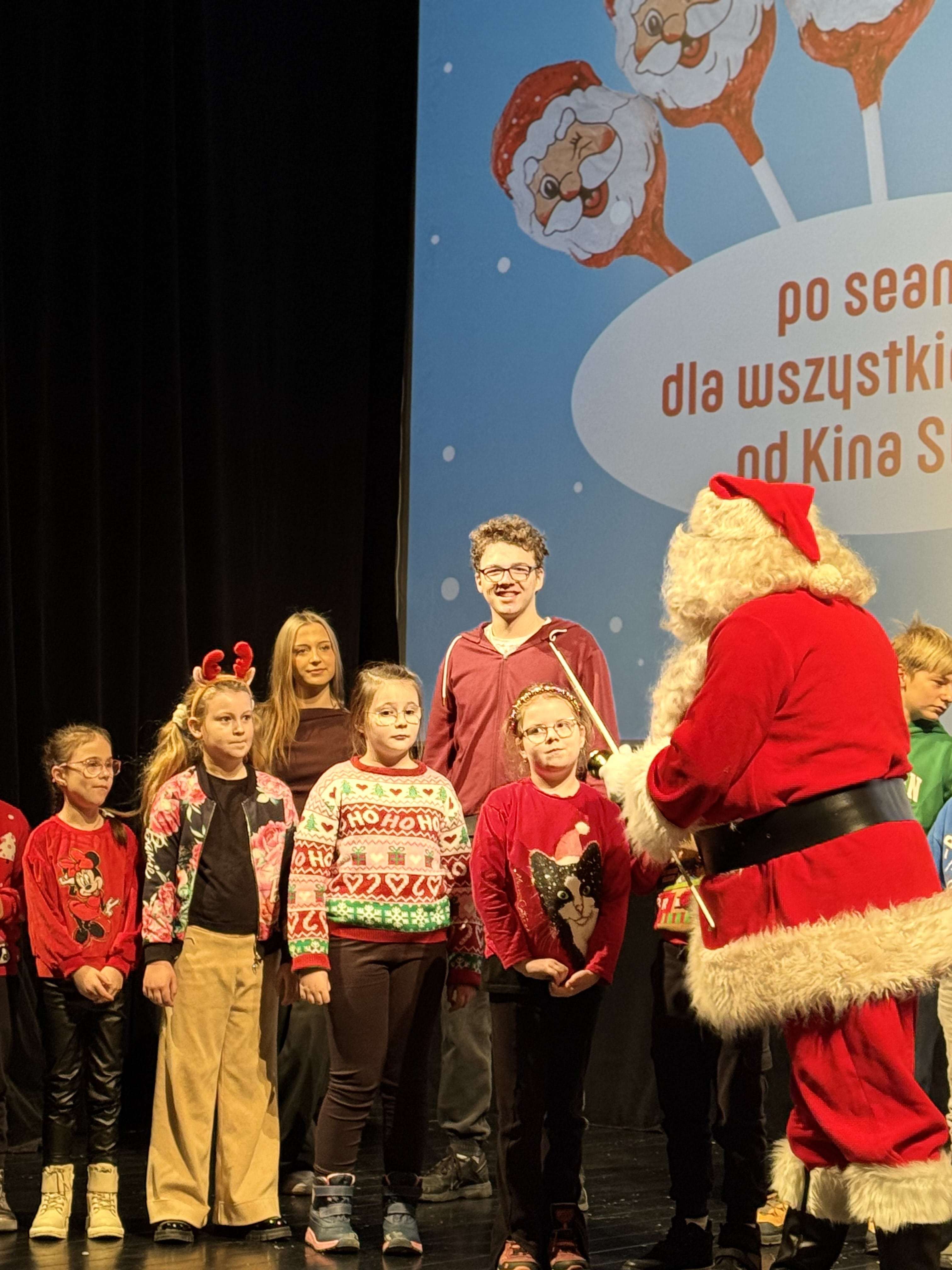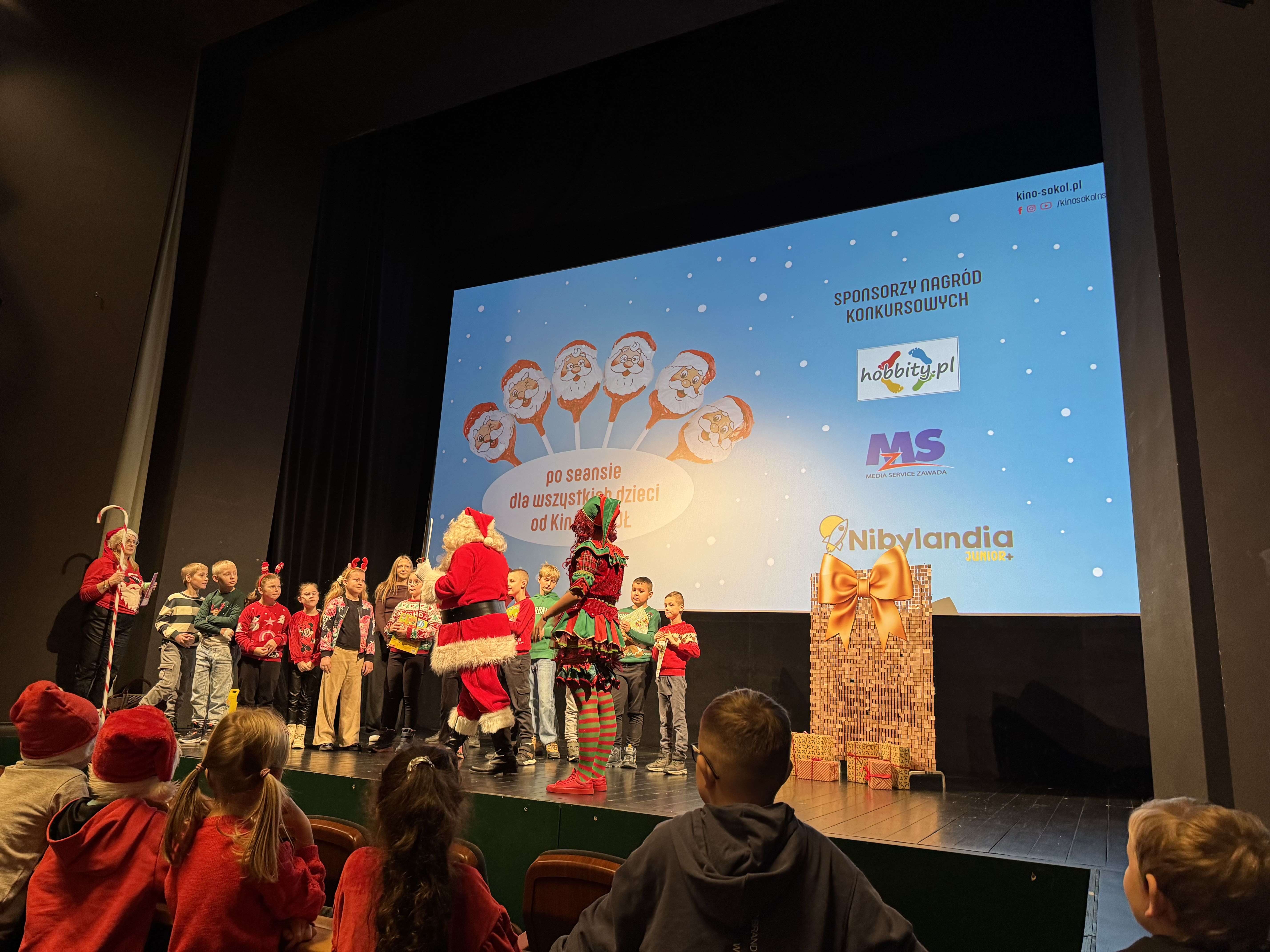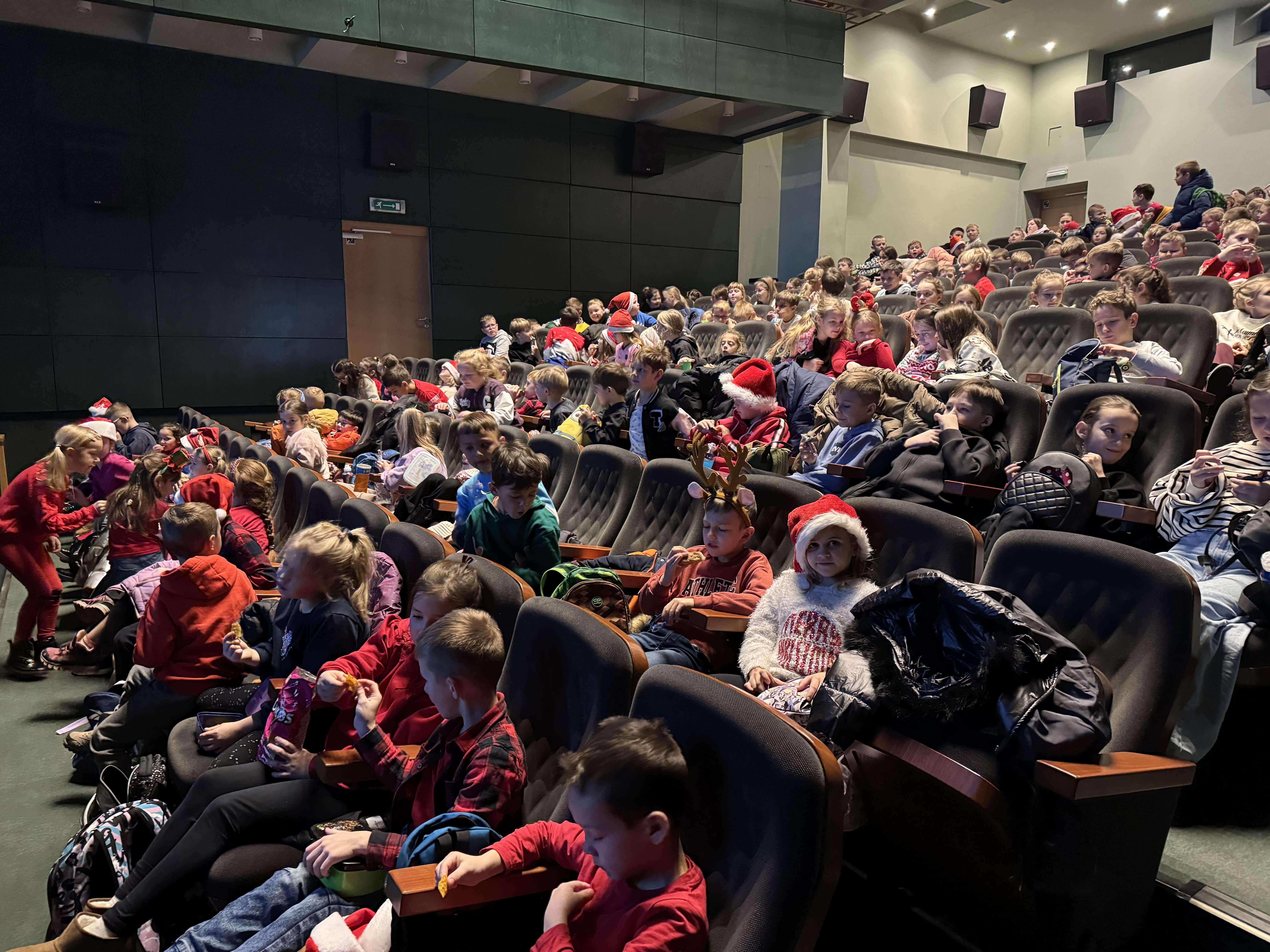 5 grudnia uczniowie klas 1–3 wybrali się na wyjątkową wycieczkę do kina „Sokół” w Nowym Sączu, która na długo pozostanie w ich pamięci. Już od samego rana czuło się świąteczną atmosferę, a dzieci z entuzjazmem wsiadały do autokaru, nie mogąc doczekać się atrakcji przygotowanych specjalnie dla nich. Po przybyciu do kina na najmłodszych czekała magiczna niespodzianka — przywitał ich Mikołaj wraz z wesołą drużyną elfów. Dzieci reagowały z zachwytem na tę świąteczną wizytę, a ich uśmiechy były najlepszym dowodem na to, jak bardzo podobało im się spotkanie.