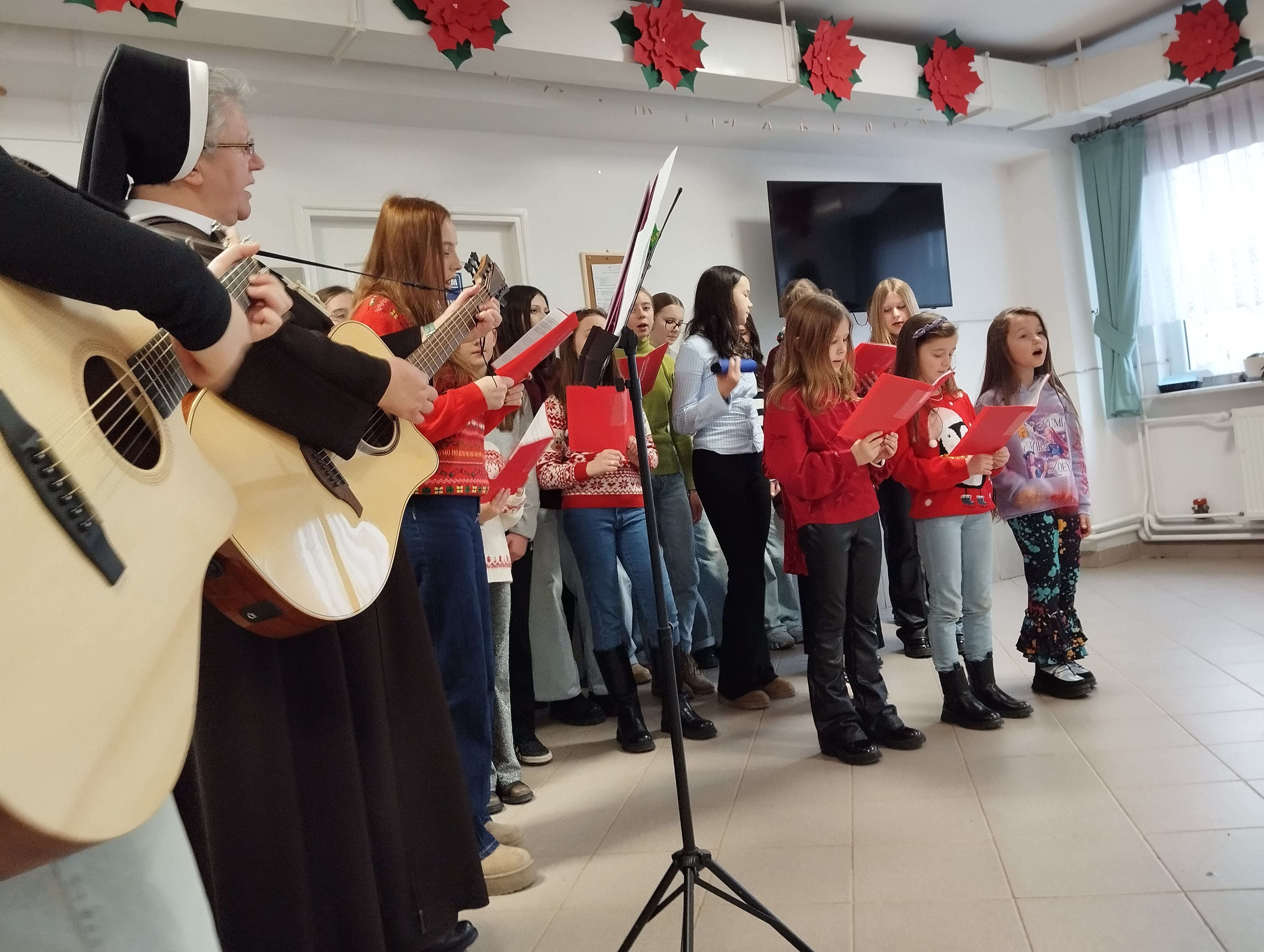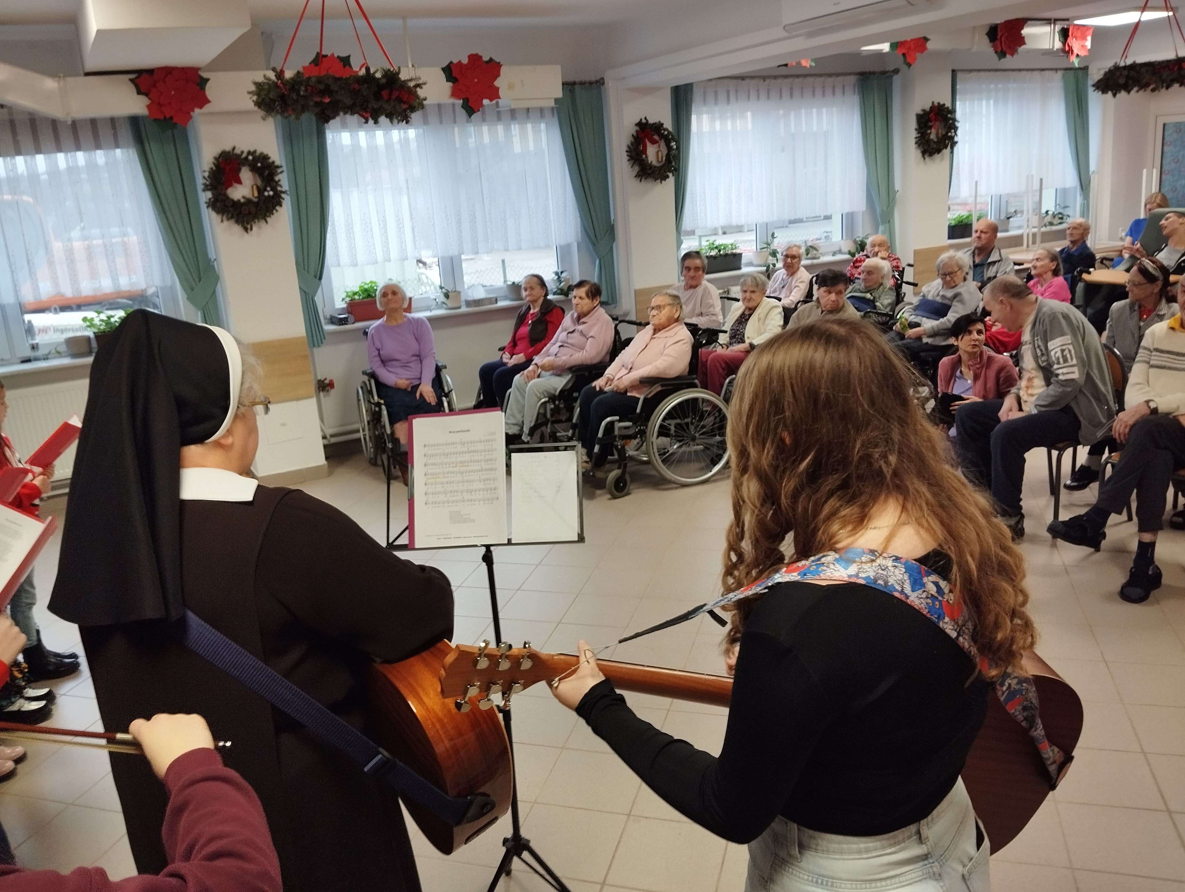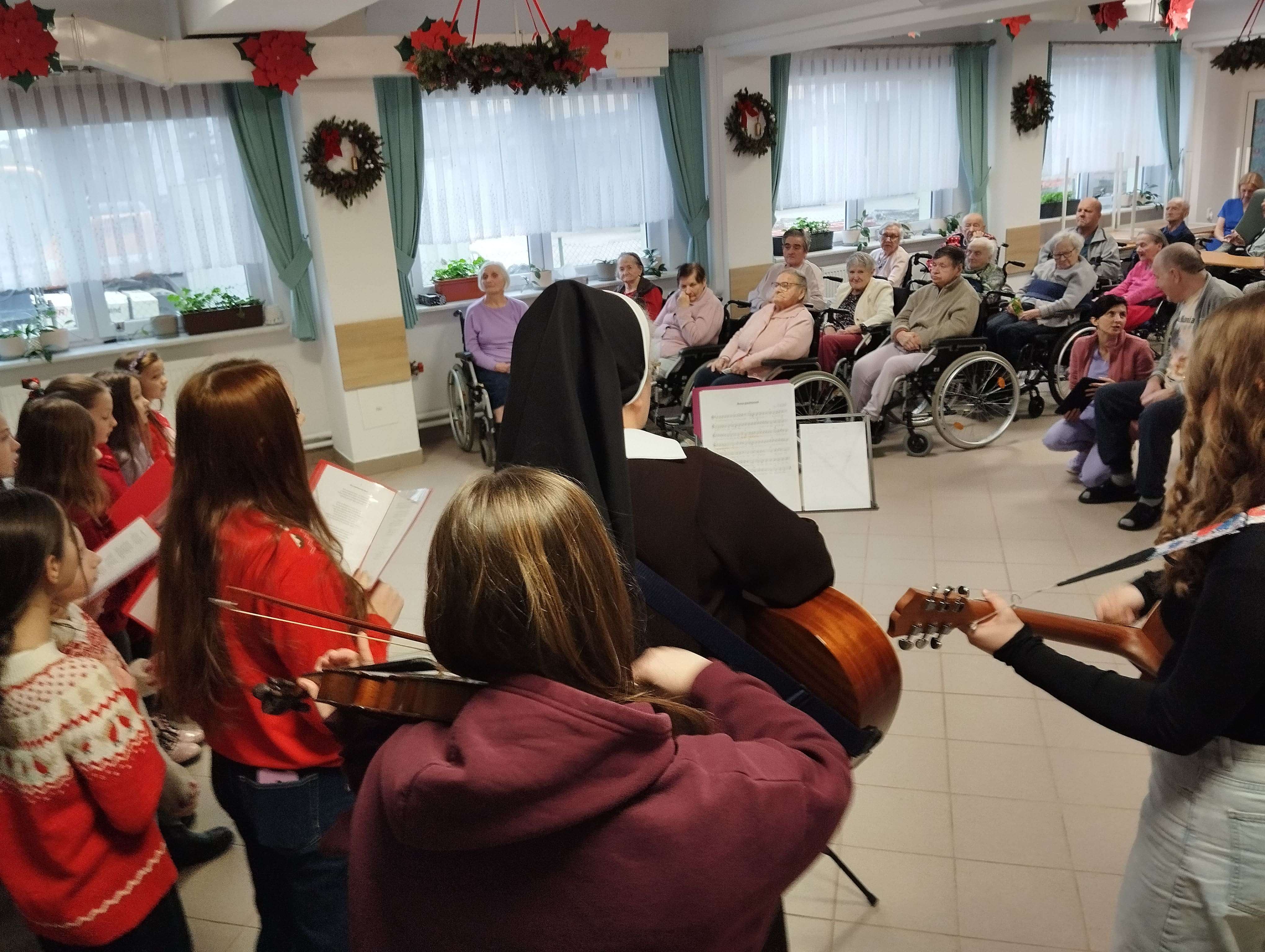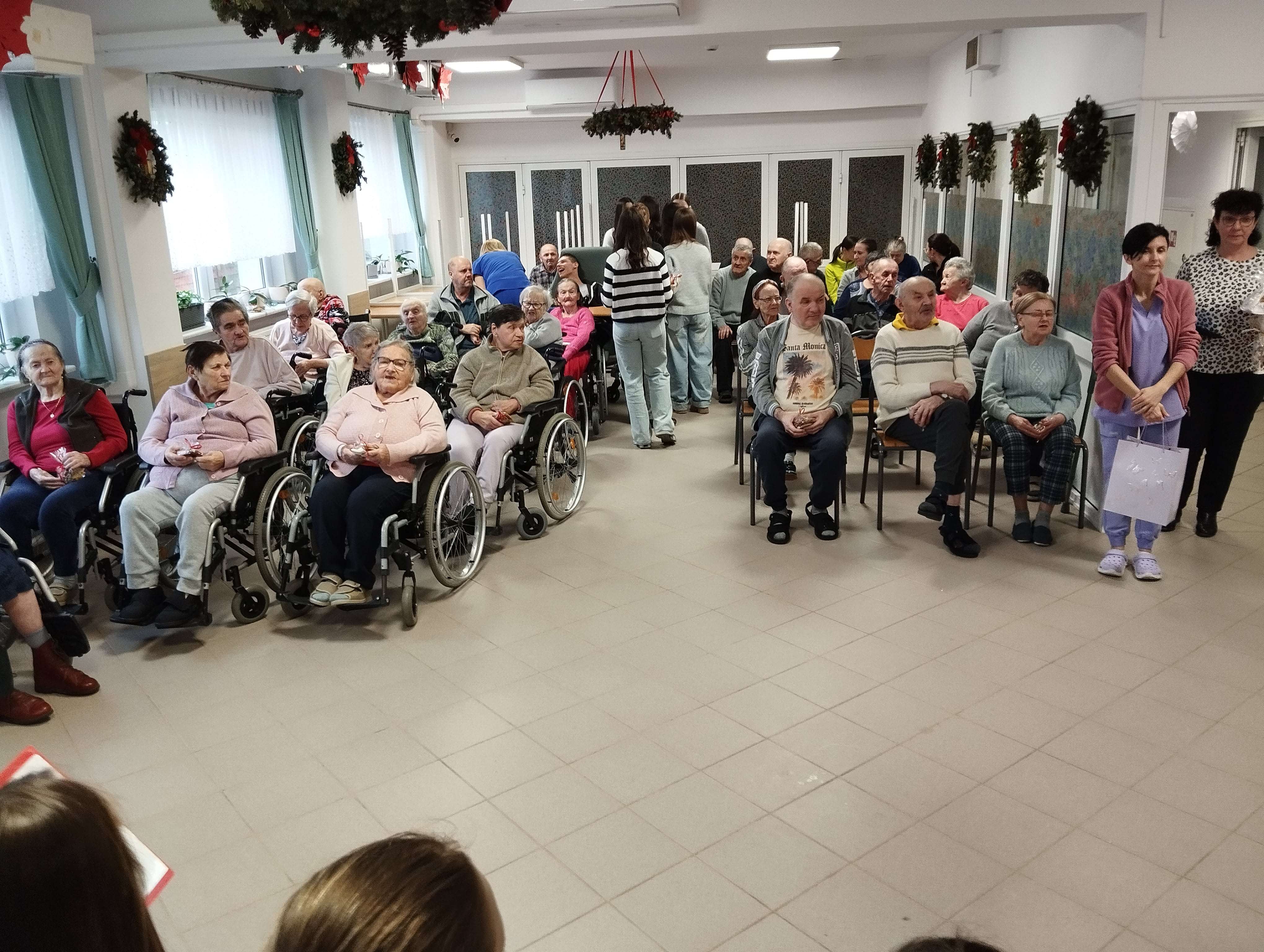 29 grudnia wolontariusze wraz z opiekunami oraz schola, działająca przy parafii w Męcinie, pod batutą siostry Iwony zagrała minikoncert kolęd dla mieszkańców DPS. Można śmiało powiedzieć, że tym razem w wizycie wzięli udział przedstawiciele dzieci i młodzieży całej Męciny, bowiem członkami scholi parafialnej są uczniowie obu męcińskich szkół. Starym zwyczajem wolontariusze złożyli najlepsze życzenia na nadchodzący Nowy Rok mieszkańcom i pracownikom DPS oraz przekazali każdemu słodki upominek w postaci domowych pierników i ciasteczek.