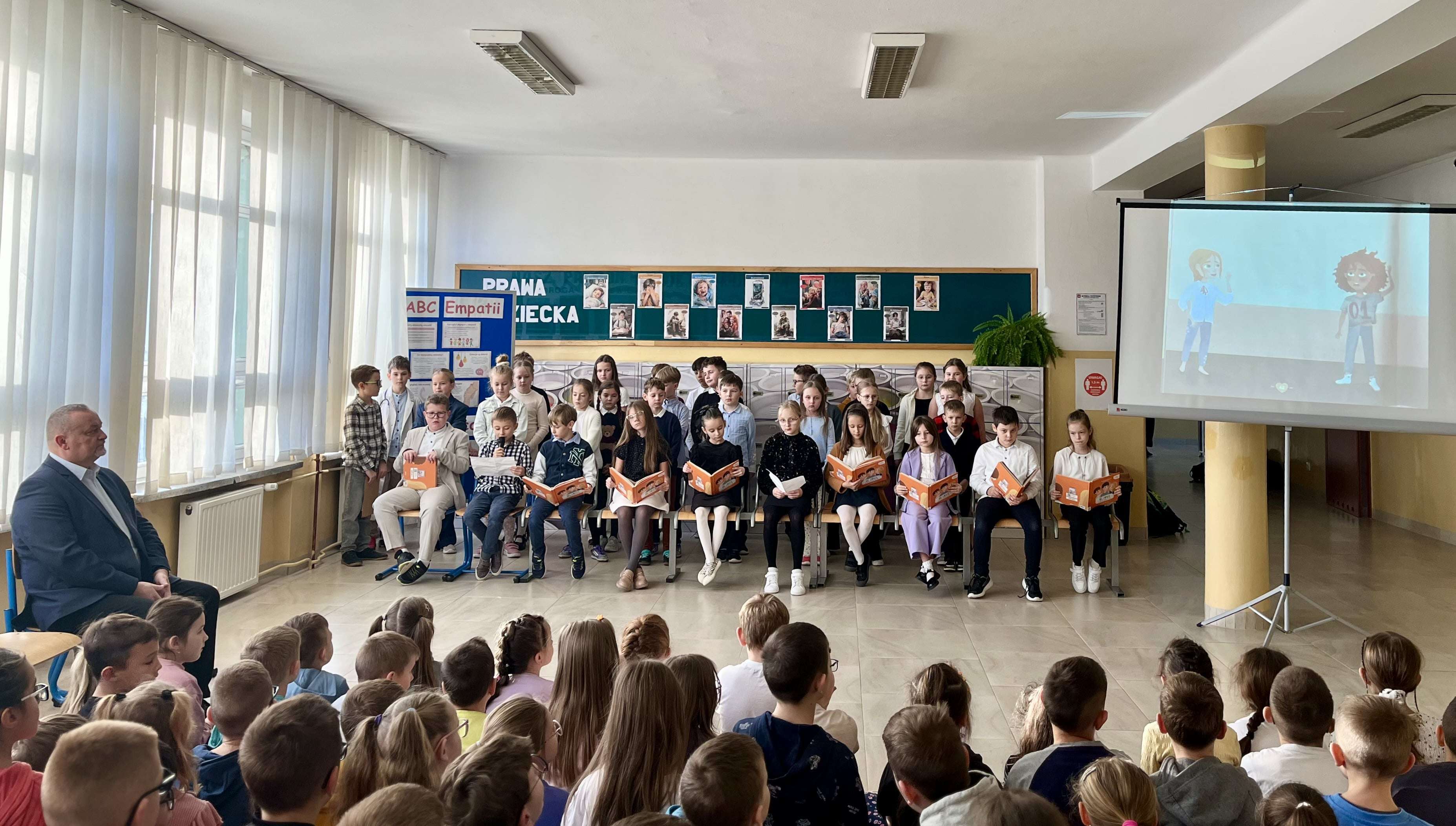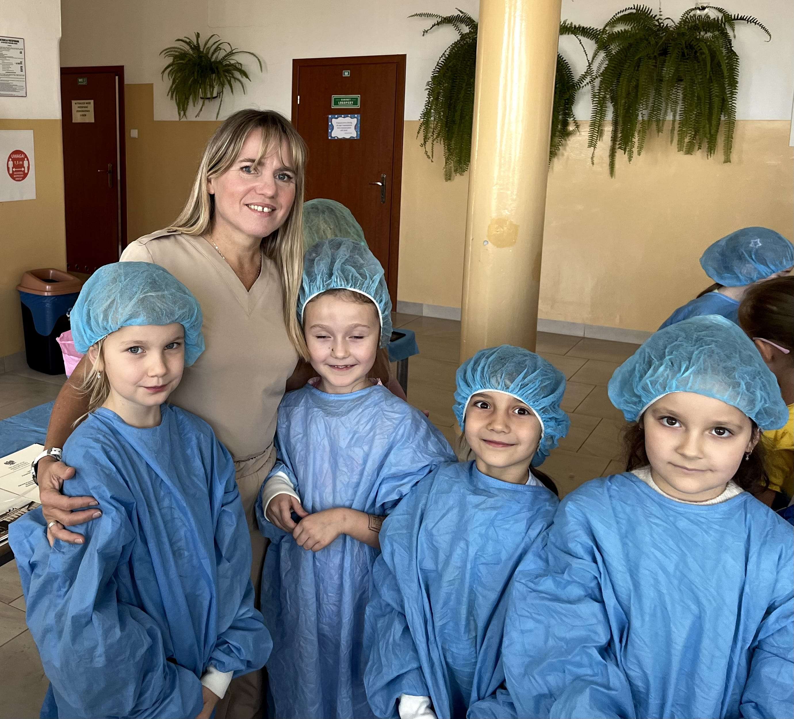 W dniu 20 listopada dzieci z oddziałów przedszkolnych 0A i 0B oraz uczniowie z klas I-III wzięli udział w wyjątkowym spotkaniu z Panią Kariną Gamoń – położną, znaną z działalności charytatywnej, autorką książek terapeutycznych dla dzieci. W trakcie spotkania Pani Karina w niezwykle ciepły i przystępny sposób opowiadała o swojej codziennej pracy na oddziale szpitalnym, przybliżając dzieciom świat medycyny z perspektywy osoby, która każdego dnia niesie pomoc innym. Przedstawiła także swoje książki terapeutyczne, m.in. „Szpitalny domek”, „Fabryka w ciele tyka” oraz „Gdzie zmysły prysły”, które pomagają najmłodszym lepiej zrozumieć, jak funkcjonuje ludzkie ciało.