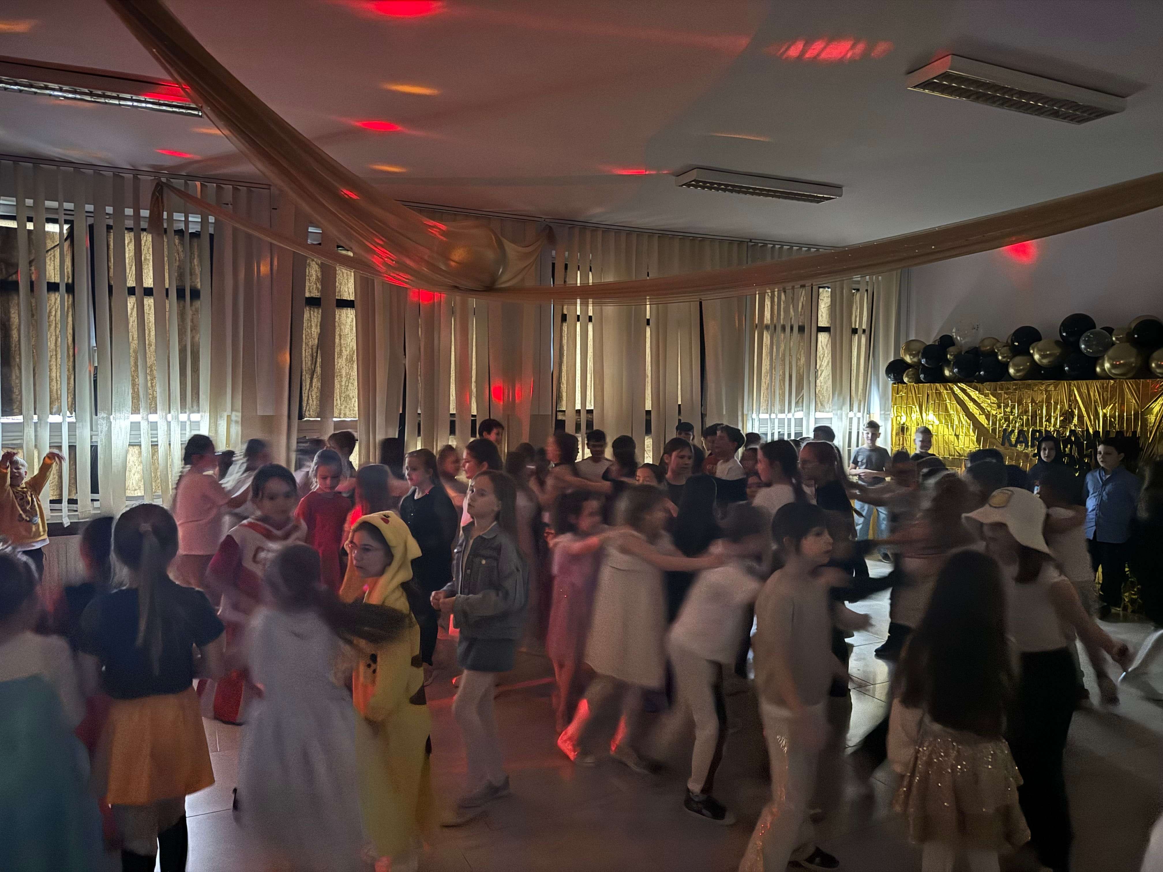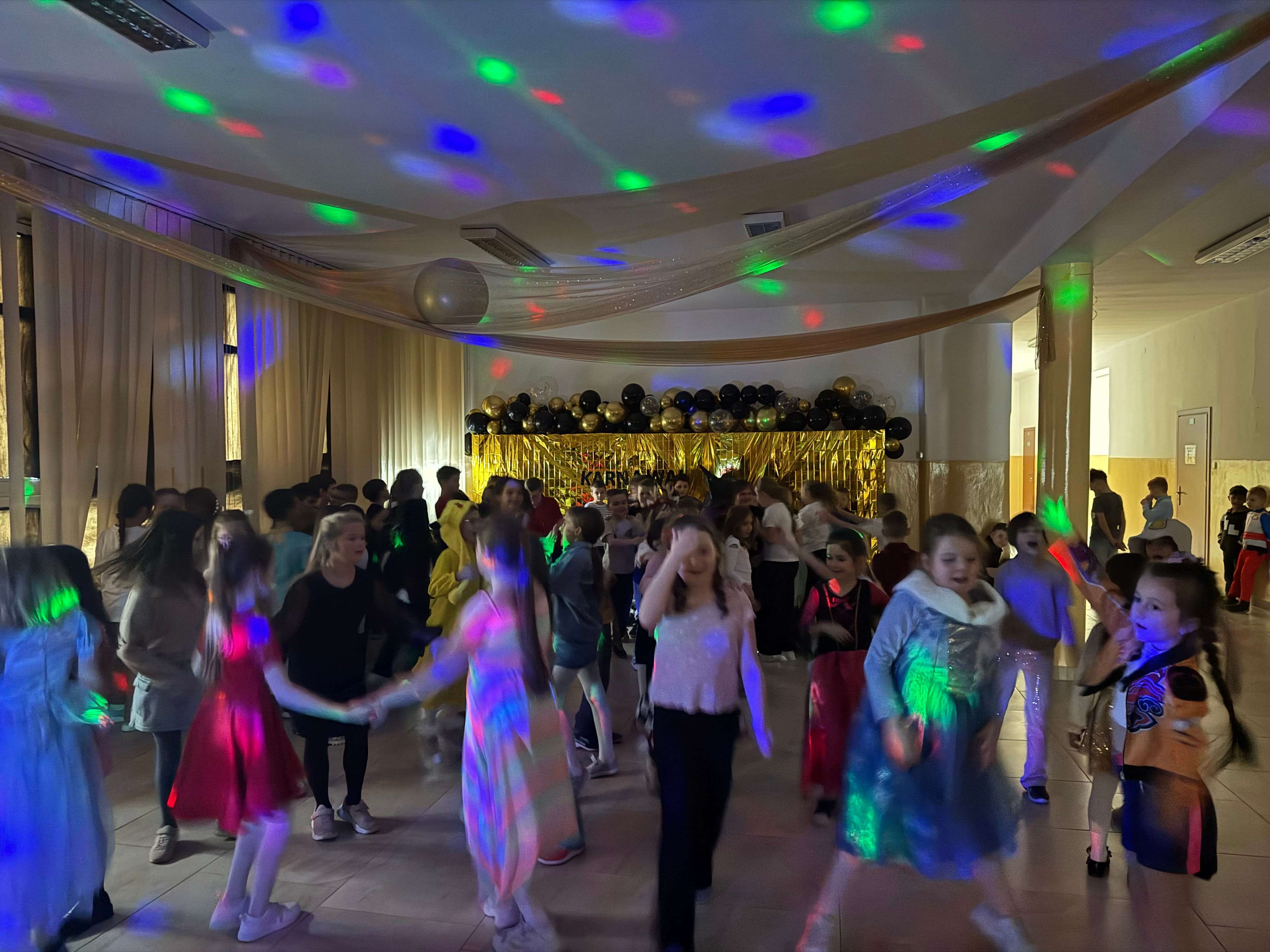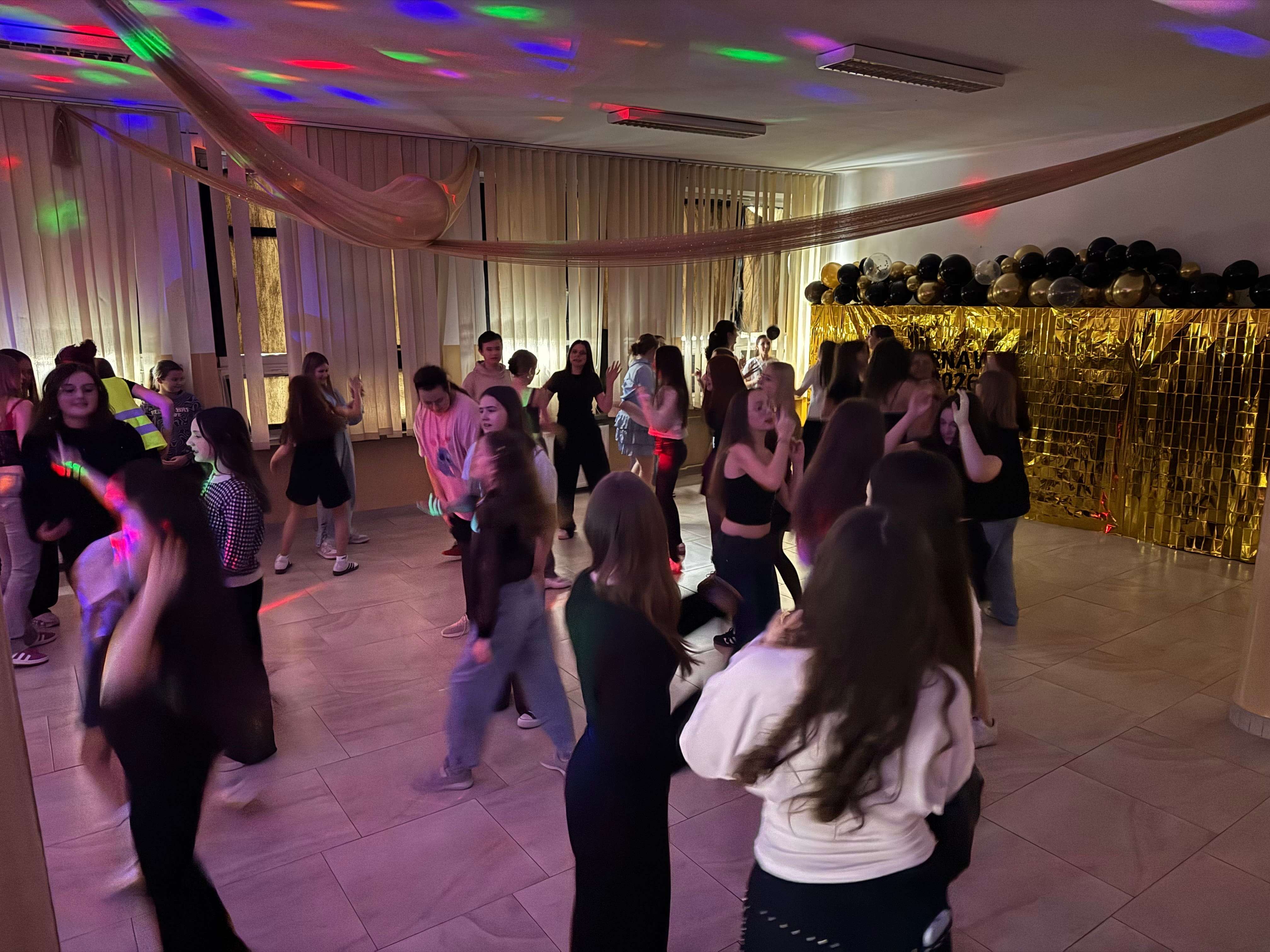 Karnawałowy wystrój holu utrzymany w tonacji czerni i złota, balonowe girlandy, migające kolorowe światła oraz muzyczne przeboje, to nie tylko przepis na udaną zabawę karnawałową. To gwarantowana dobra impreza i tak tegoroczna zapisała się w pamięci uczniów.